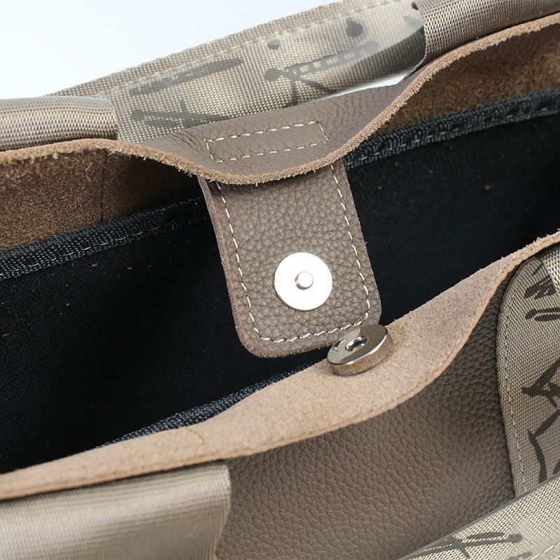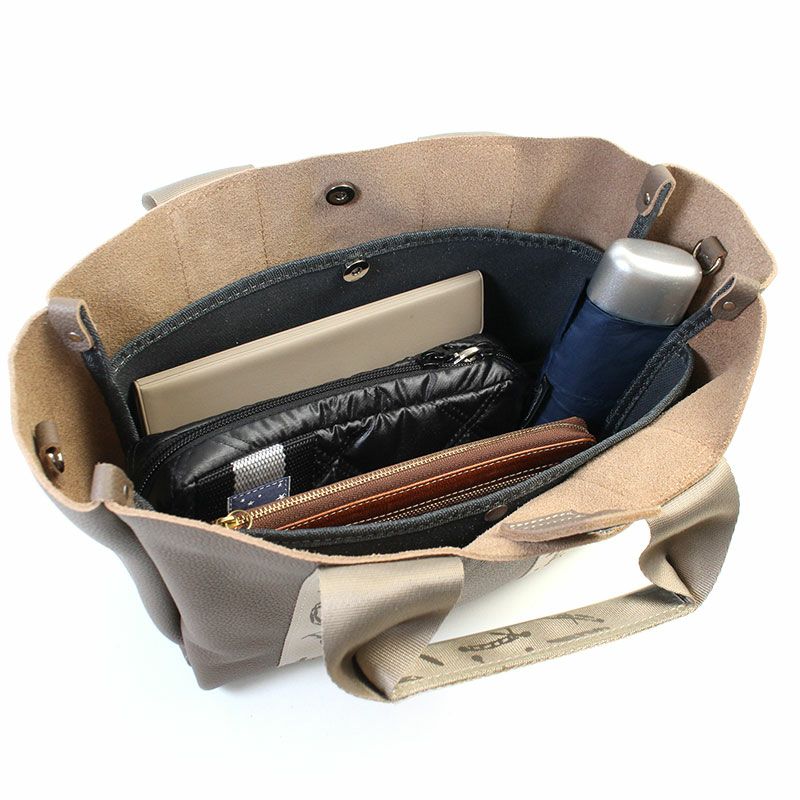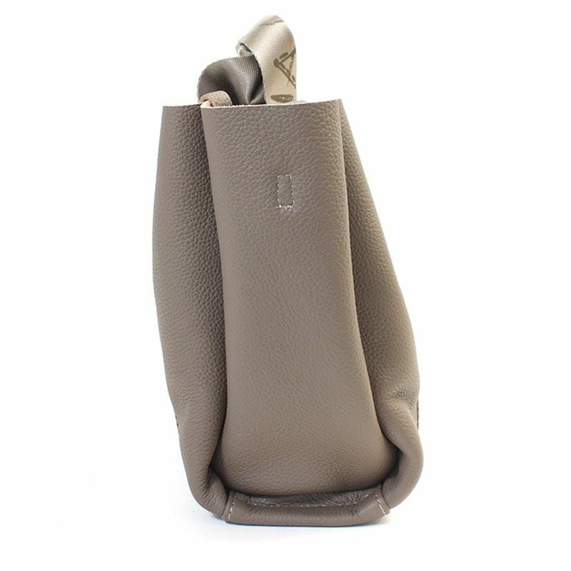表側は柔らかなレザーで内側はコットンキャンバス地が重なっていて上品なデザインのハンドバッグ。