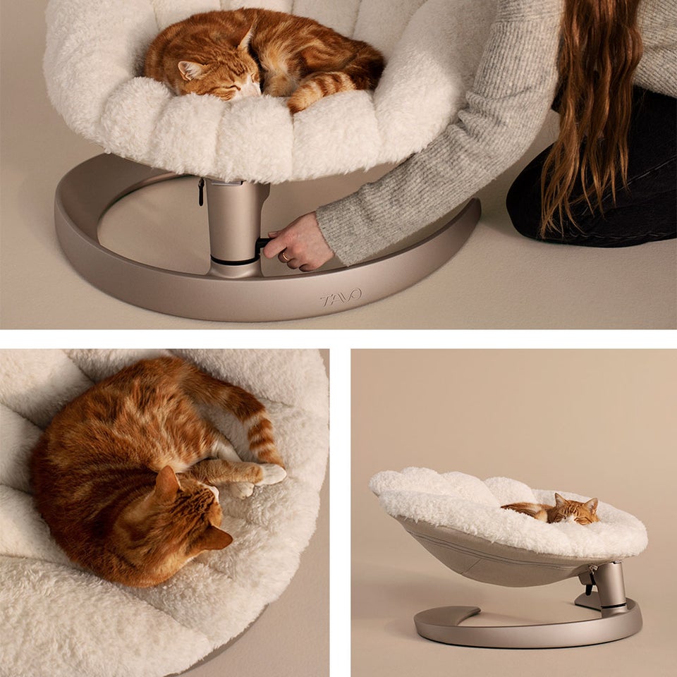 曲線を描くアルミフレームと洗練されたフォルムが、インテリアに自然に溶け込むデザイン。現代アートのような美しいフォルムはリビング空間のアクセントにもなります。コードやモーターがない静かな構造で、デザイン性と快適性を両立した上質なペットベッドです。
