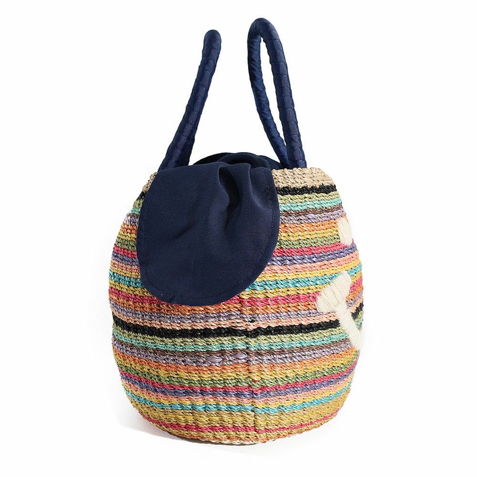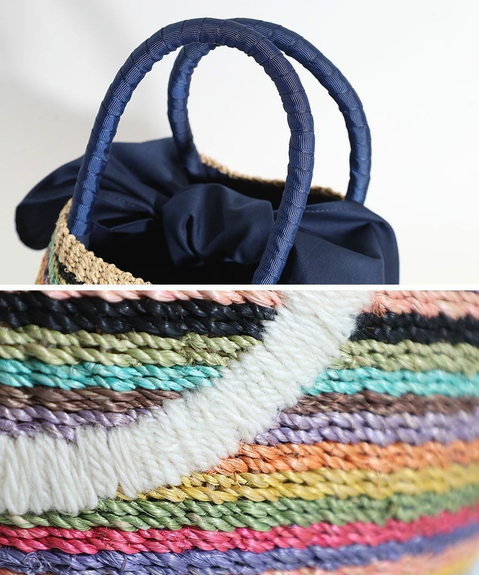 鮮やかなレインボーのカラーが印象的なかごバッグ。