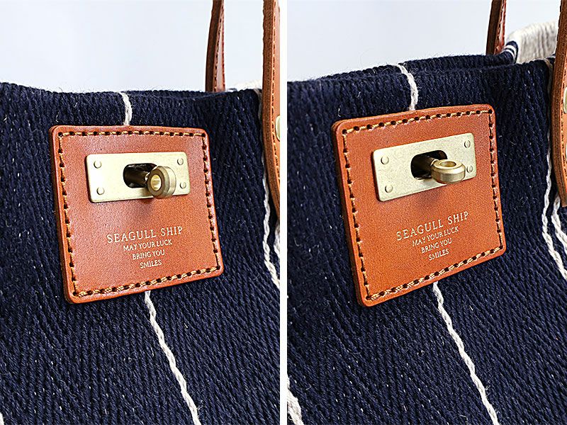 ブルーのラインと本革のコントラストが特徴のショルダー付きトートバッグ