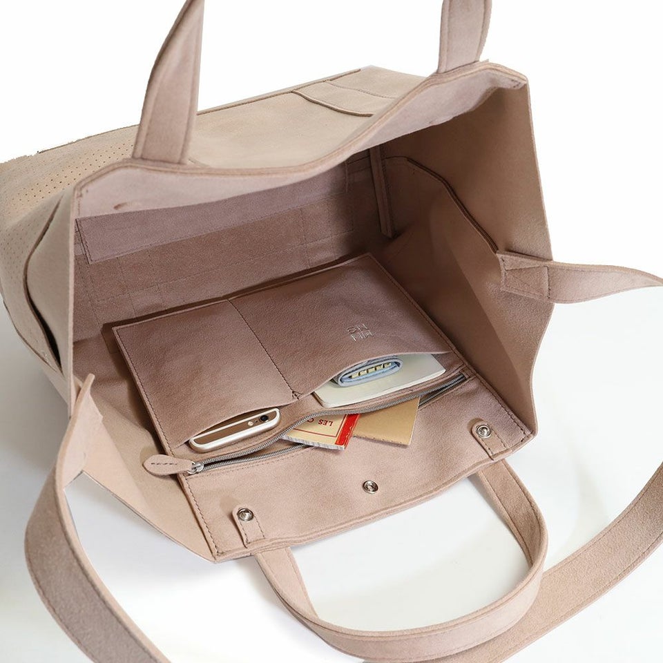 外側にはパンチング加工の2つのポケットがあり、内側にはファスナーポケットがひとつと2つのオープンポケットが装備されているとても使いやすい仕様です。