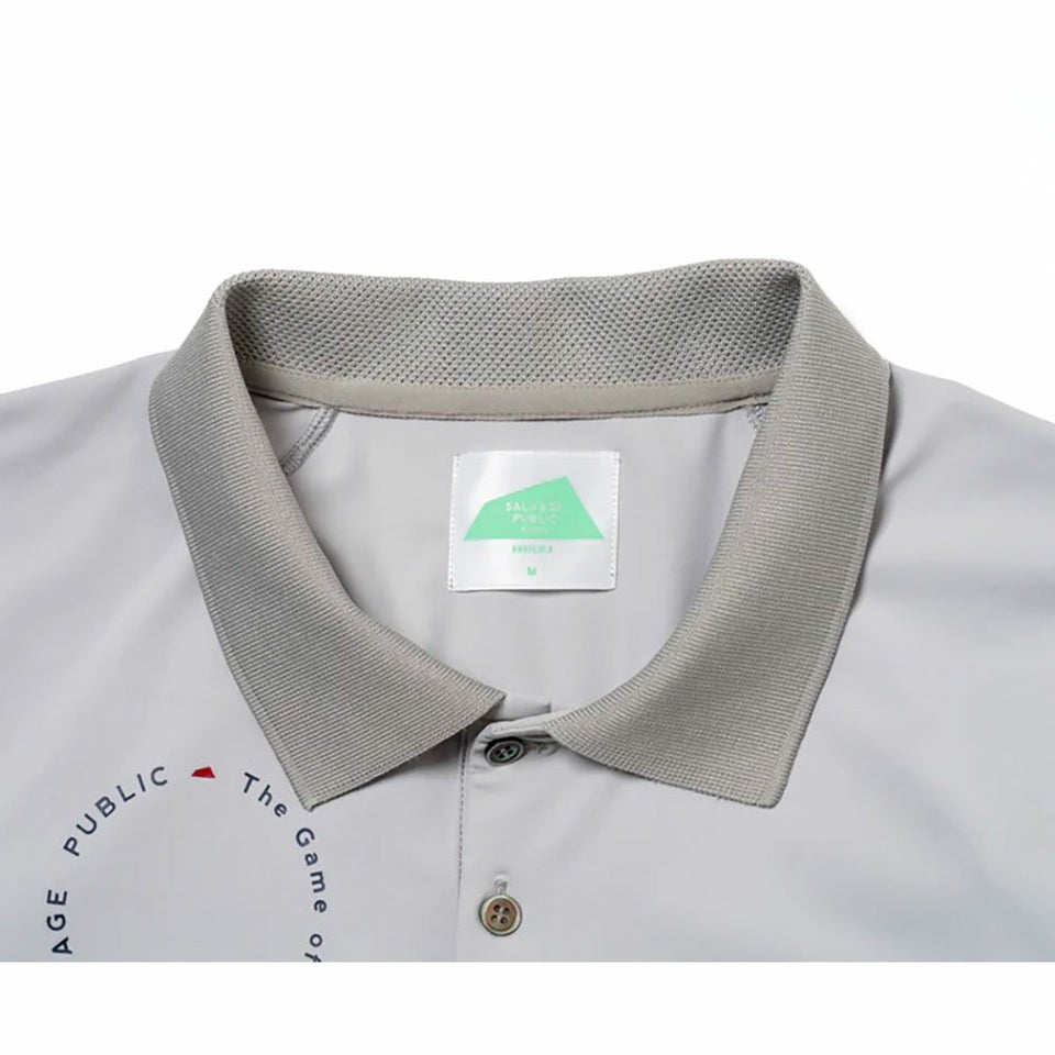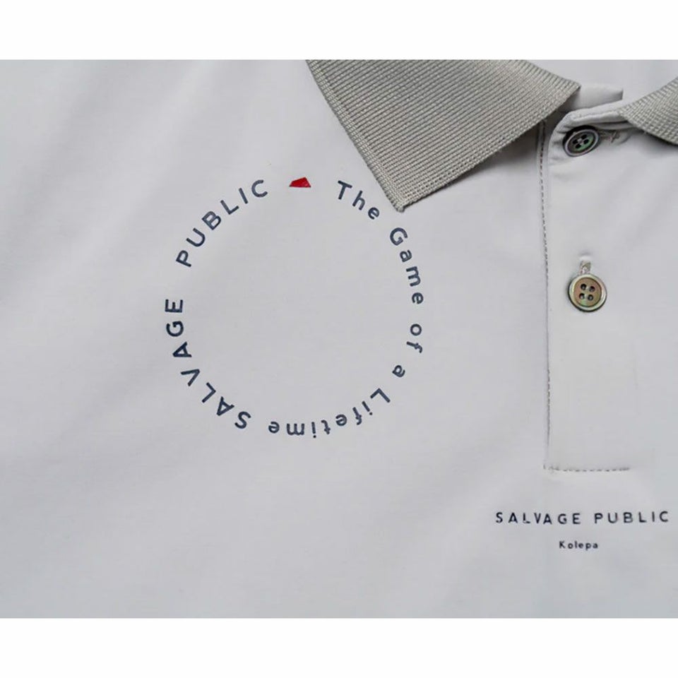 フロント前立て下に小さくSALVAGE PUBLIC Kolepaスタンプロゴ、右胸にThe Game of a Lifetime/ゴルフは一生のゲーム のサークルロゴのプリント入り。