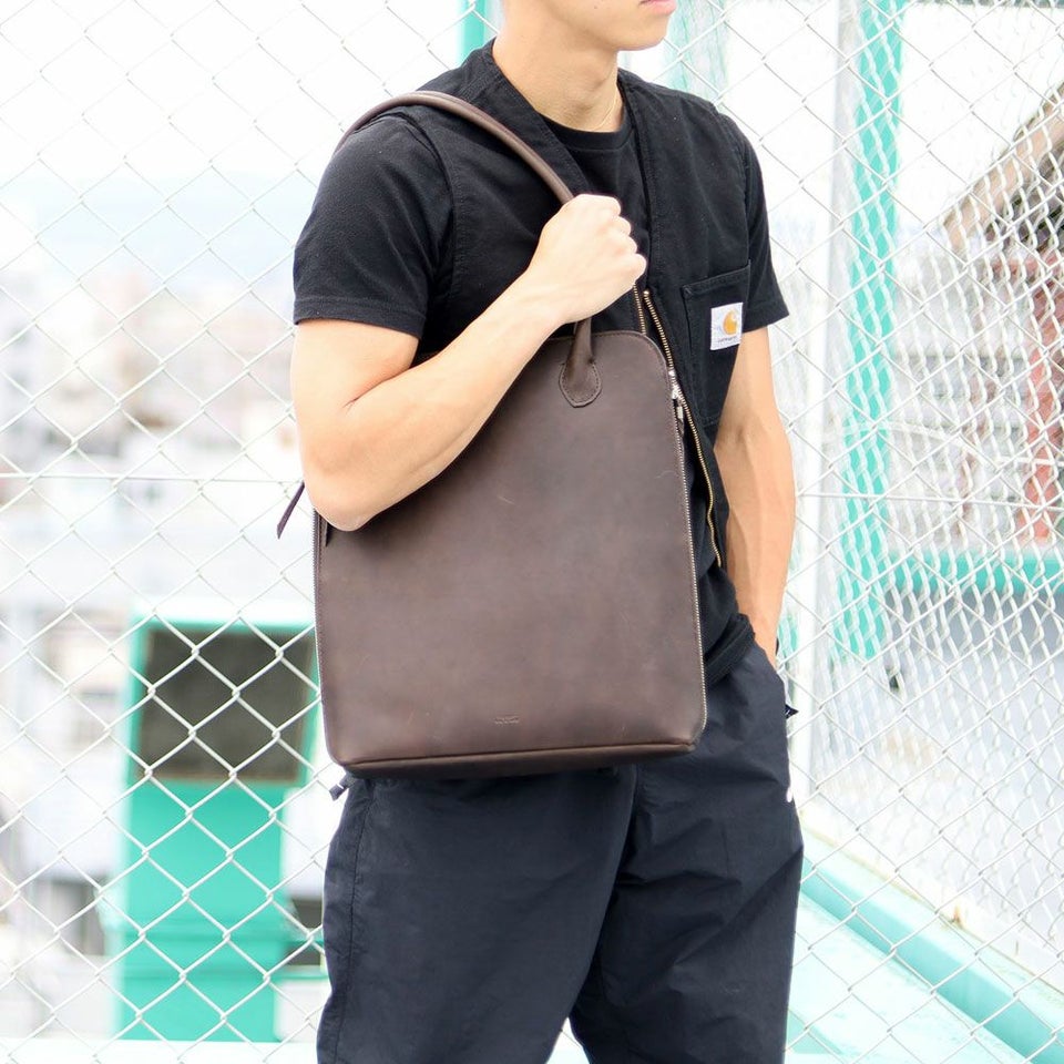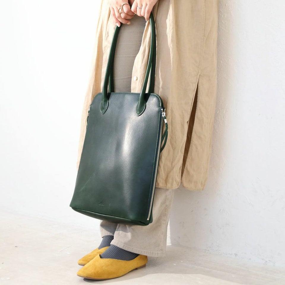 両サイドがファスナーで開閉できる縦型トートバッグです。アウターの上からでももたつく心配のない、長めのハンドルデザイン。