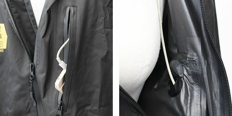 止水ファスナーを採用し、縫い目にはシームテープを施しています。