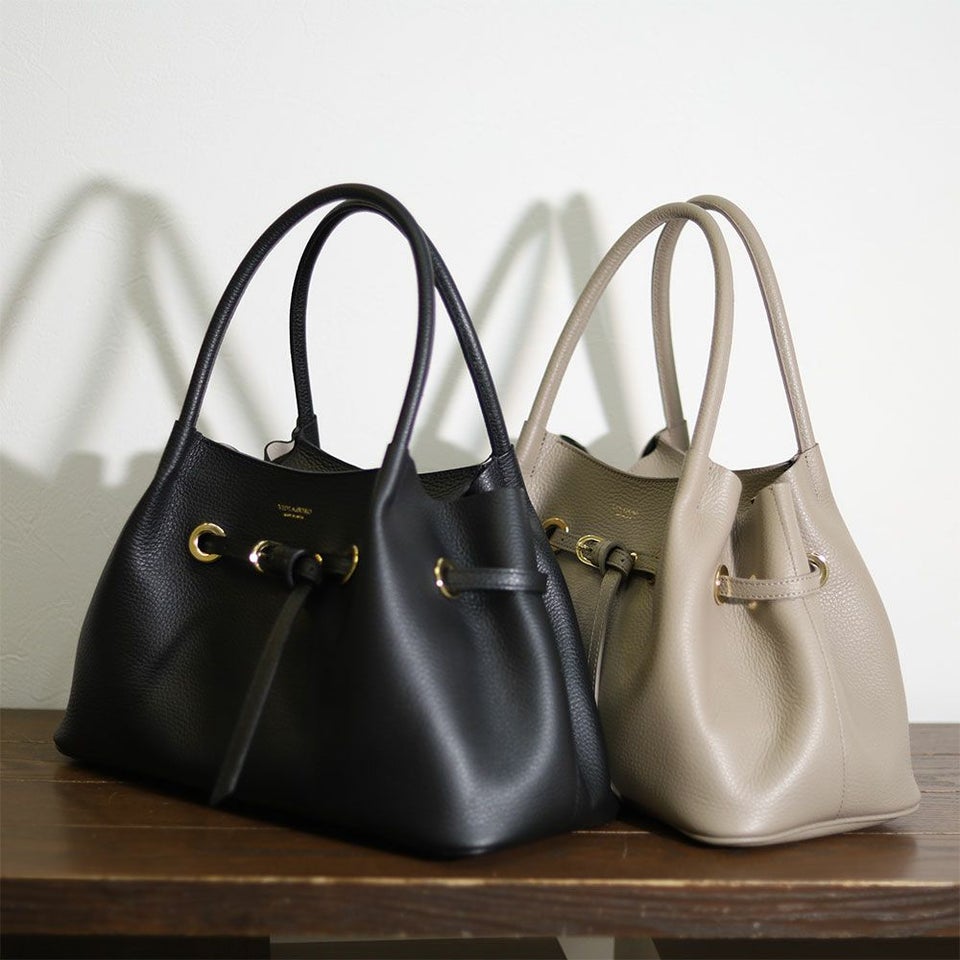 上質なイタリアンレザーとすっきりとしたフォルムが、ビジネスシーンにも違和感なく調和します。傷が目立ちにくい素材のため毎日使っても美しさを保ちやすく、品のある佇まいが大人の女性のスタイルを引き立てます。通勤にも最適な頼れるトートです。