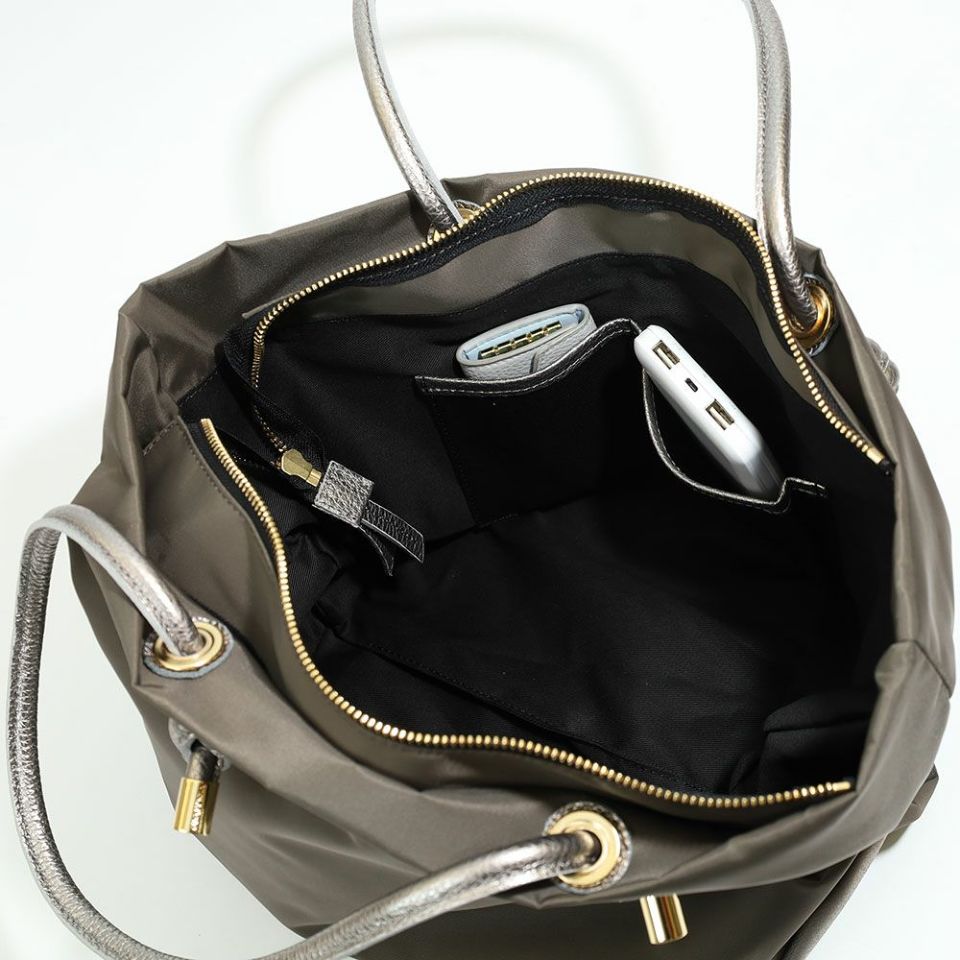 シンプルなデザインのボディにメタリックレザーのノットハンドルがアクセントになったトートバッグのSサイズ。 内側は3層に分かれており、ファスナーを閉めたままアオリポケットにスマホやパスなどを収納できるので通勤などで安心してお使い頂けます。 長財布やペットボトルなどが収納できます。 弱撥水性があるのでお手入れも簡単で、軽量なのも特徴です。