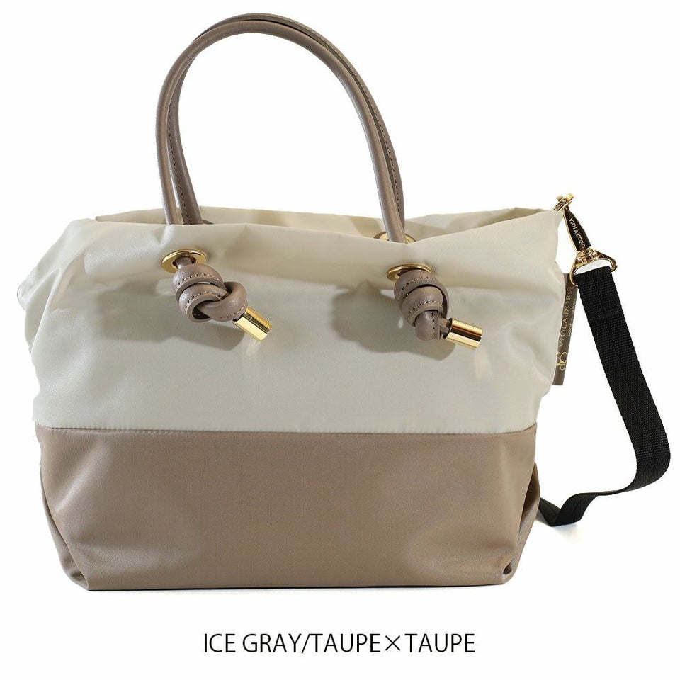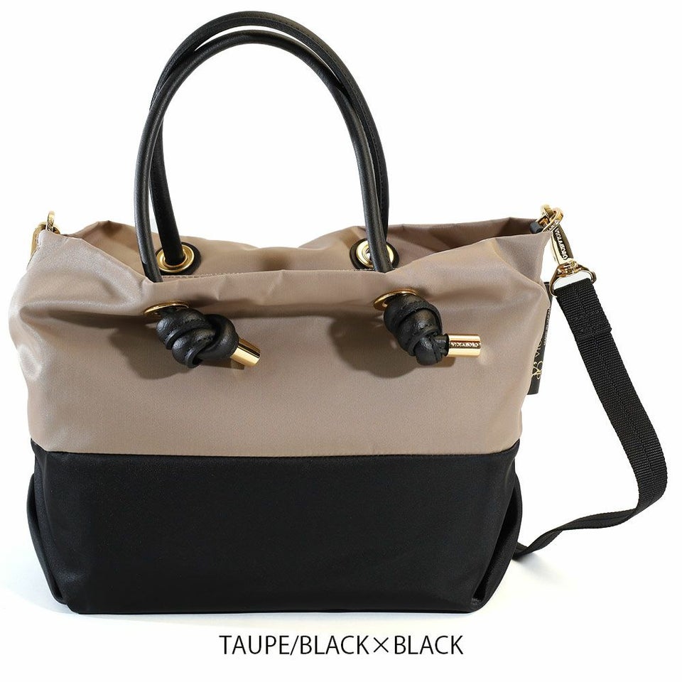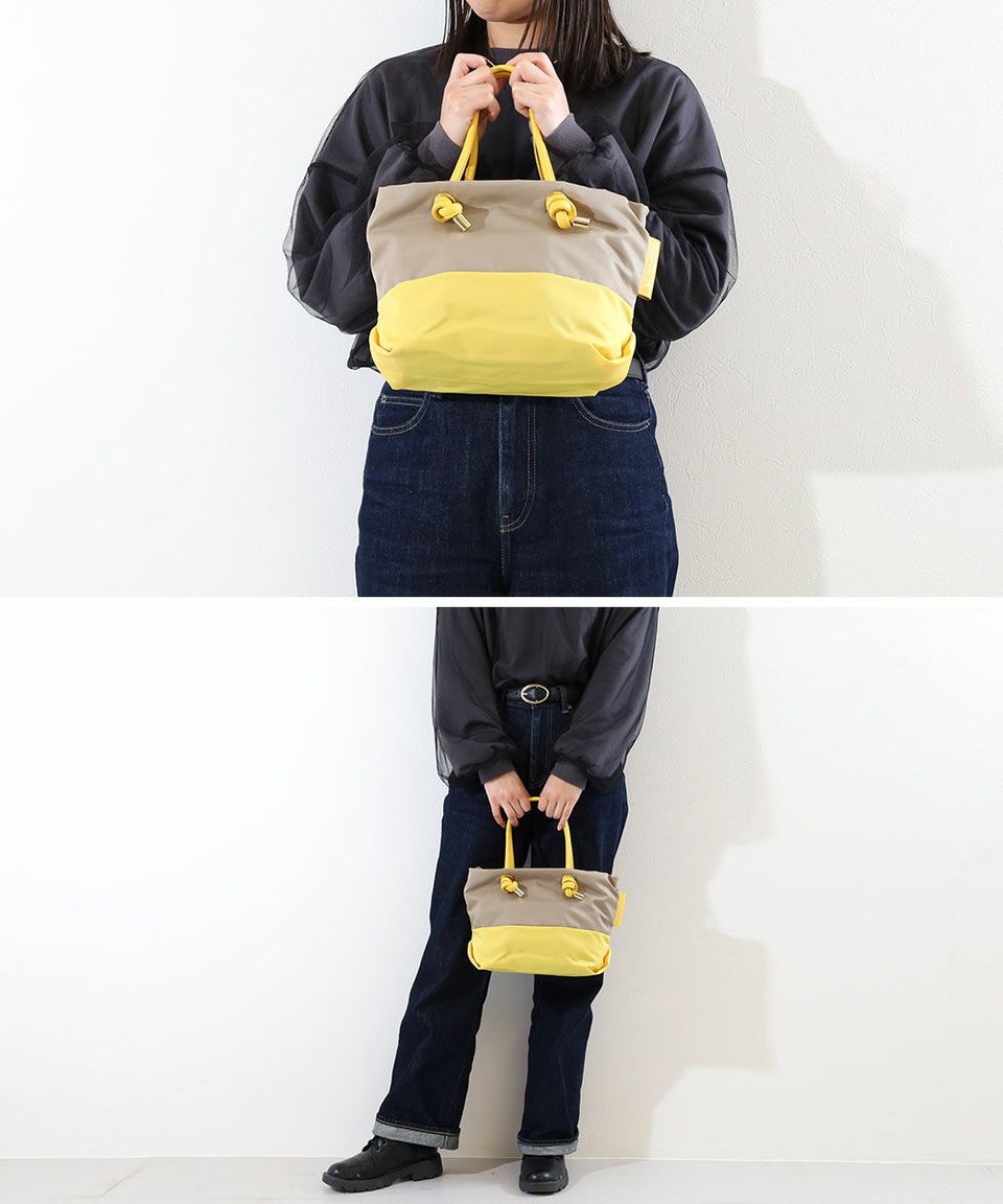 バイカラーのナイロンボディにノットハンドルがアクセントになったトートバッグのSサイズ。