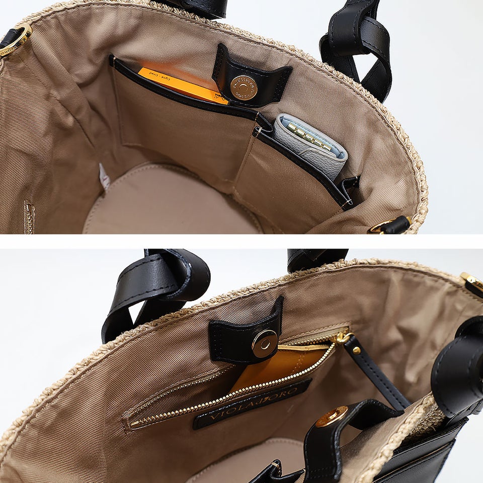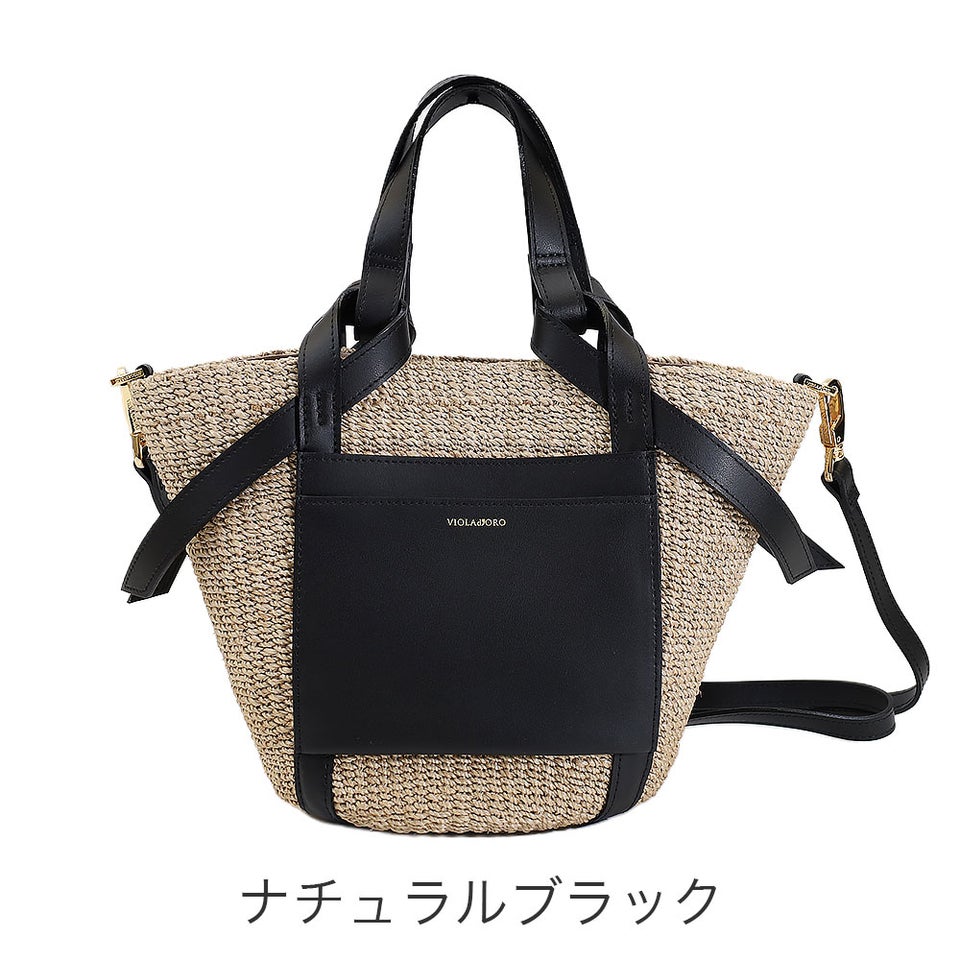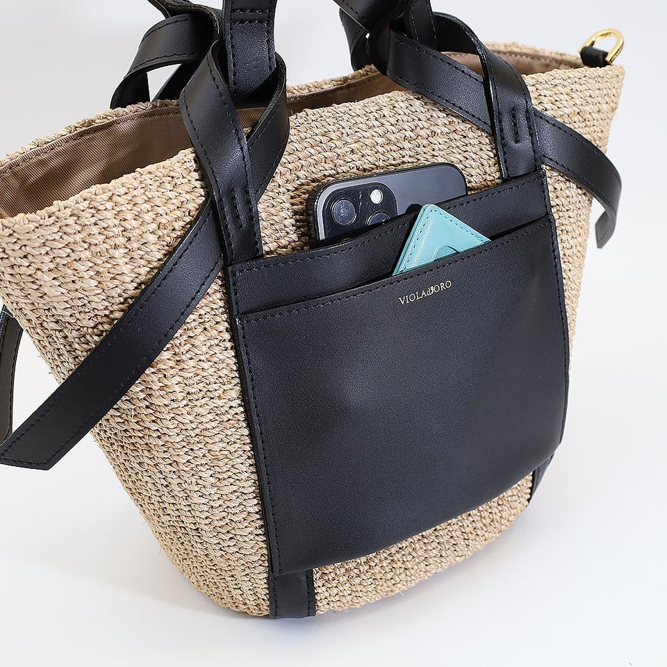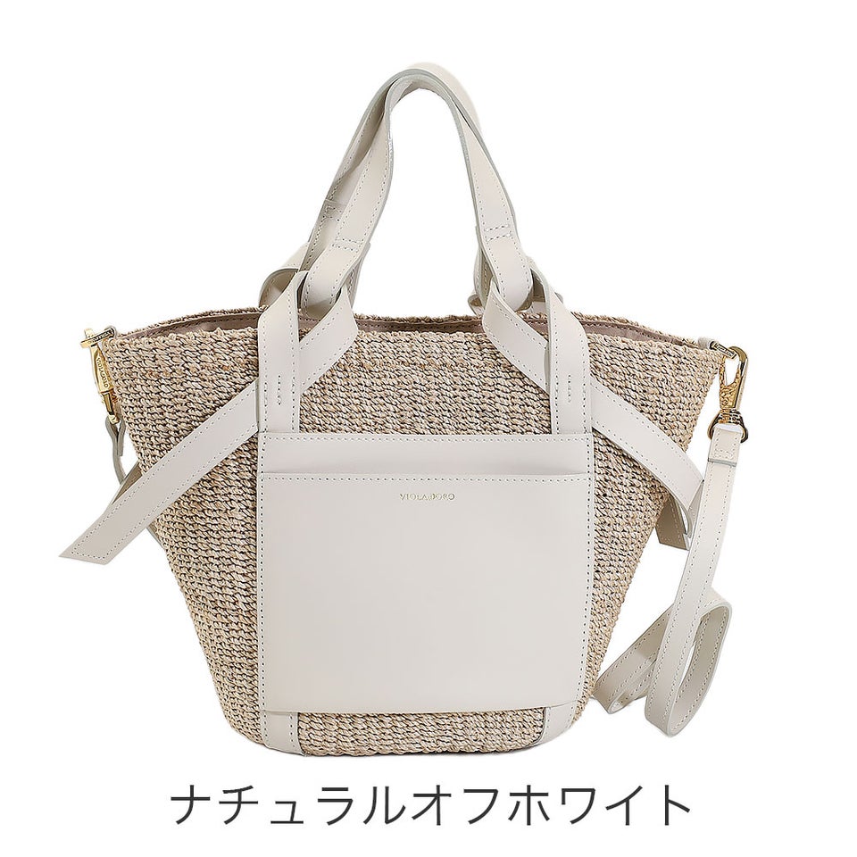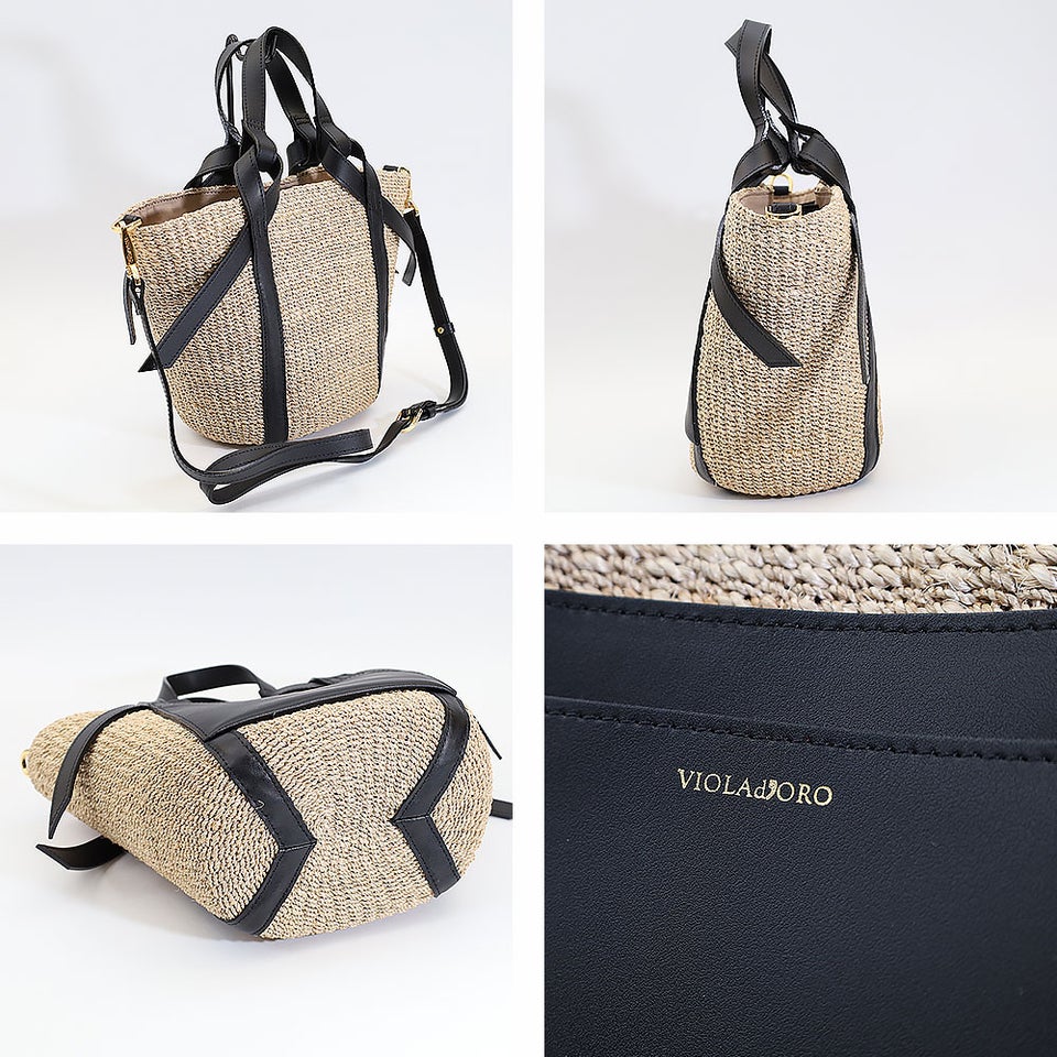 舟形のアバカボディにレザーポケットとハンドルを組み合わせたデザインがポイント。ナチュラル素材とレザーのコントラストが上品なアクセントになり、大人の装いに自然と馴染みます。シンプルながら洗練されたディテールが、ヴィオラドーロらしい品のある雰囲気を演出します。