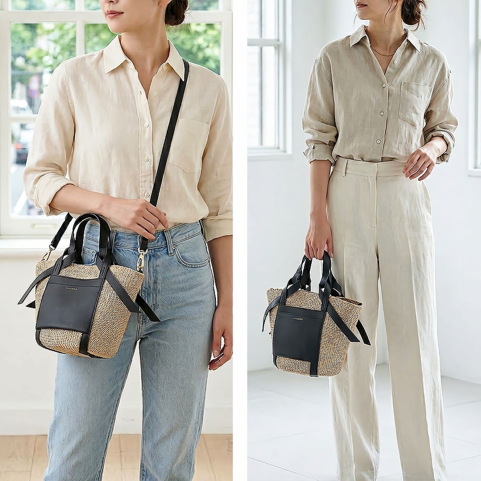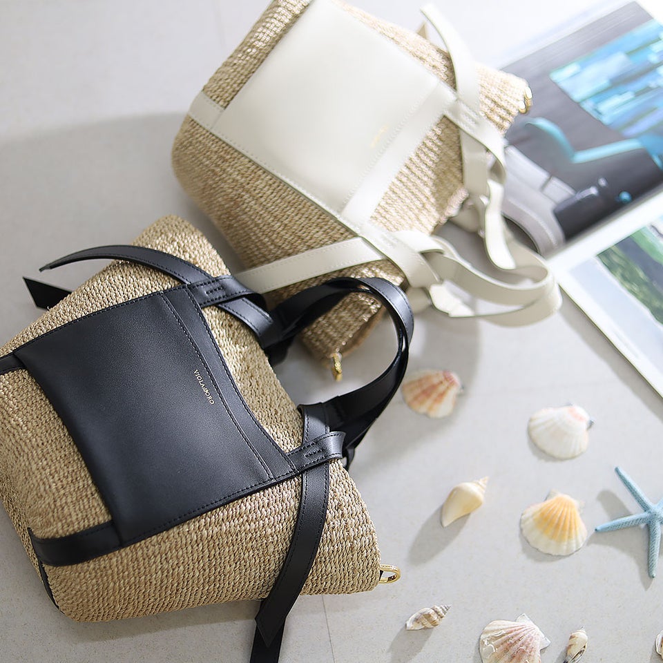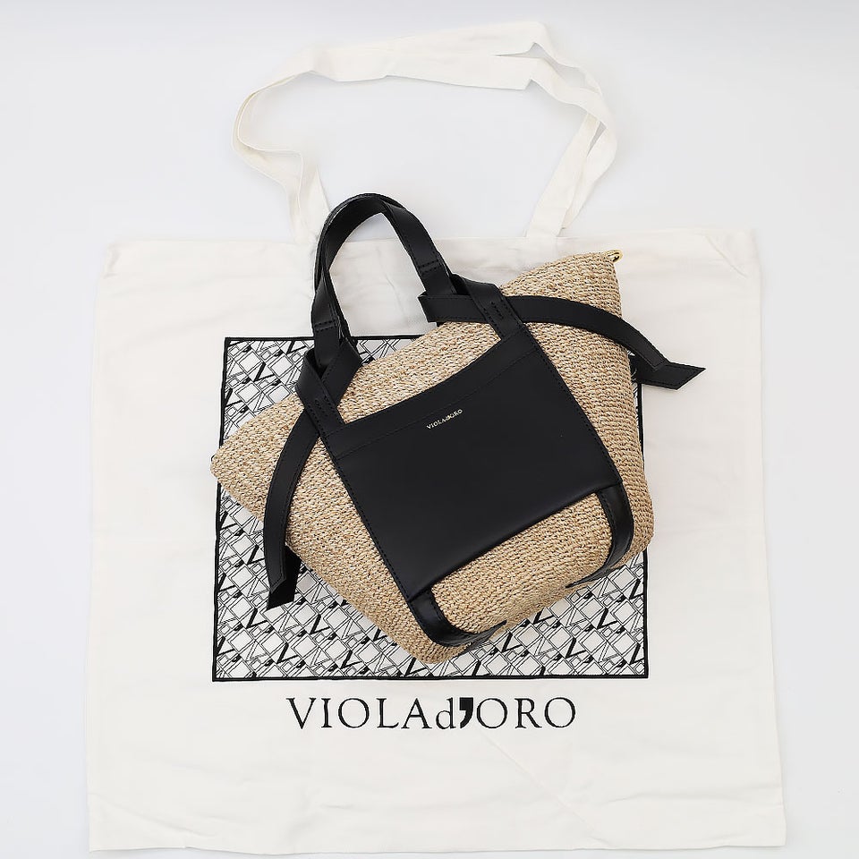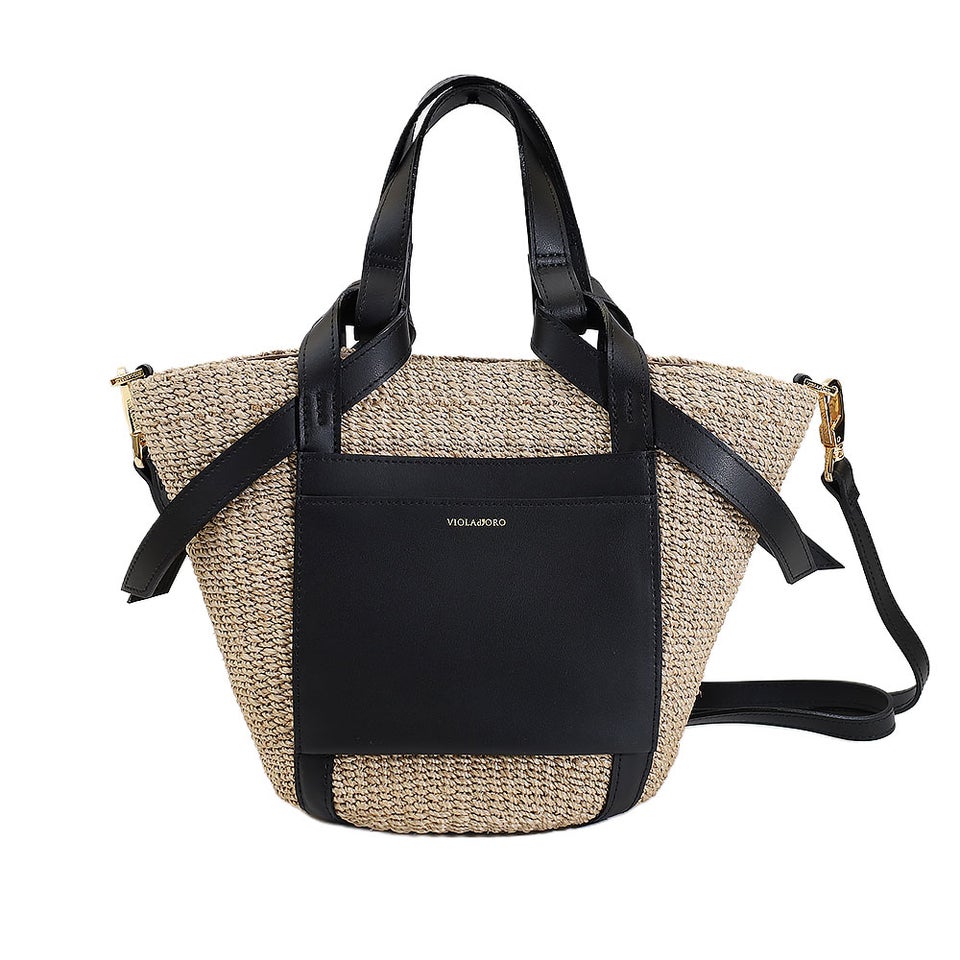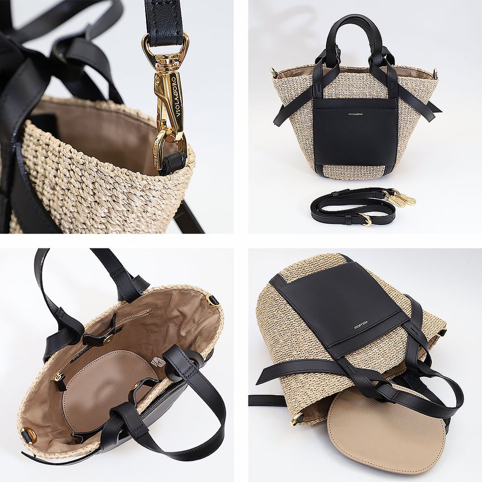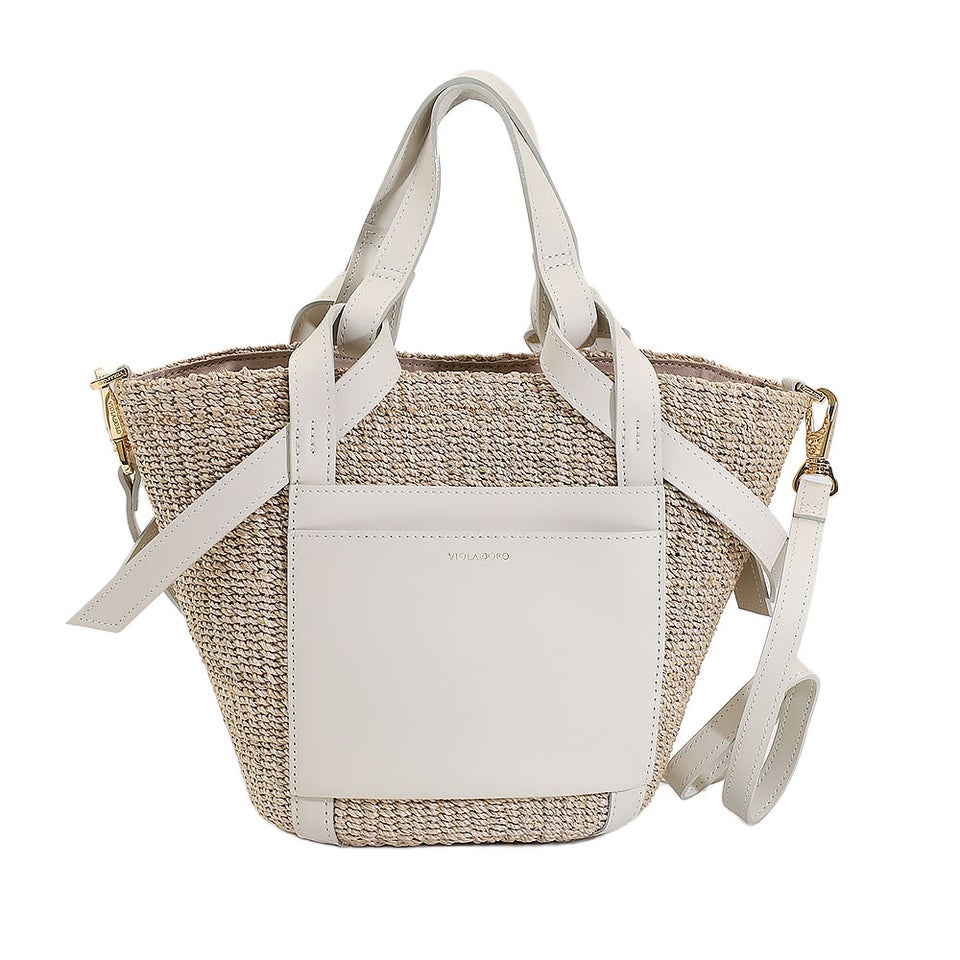 舟形のアバカボディにレザーポケットとハンドルを組み合わせたデザインがポイント。ナチュラル素材とレザーのコントラストが上品なアクセントになり、大人の装いに自然と馴染みます。シンプルながら洗練されたディテールが、ヴィオラドーロらしい品のある雰囲気を演出します。