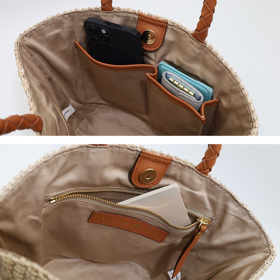 アバカ繊維の糸を糸車でさらに撚り上げたファインアバカを使用。一般的なかごバッグよりも繊細で整った編み目が特徴で、天然素材でありながらきれいめな印象に仕上がっています。ナチュラル素材の軽やかさとヴィオラドーロらしい洗練された雰囲気を兼ね備え、カジュアルからきれいめまで幅広いコーディネートに合わせやすいバッグです。