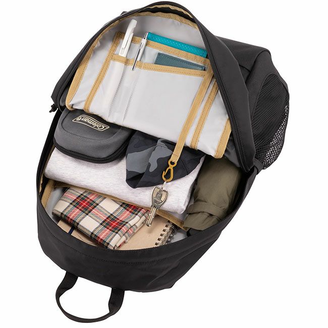 フロントにファスナーポケット、サイドにはメッシュポケットを装備。