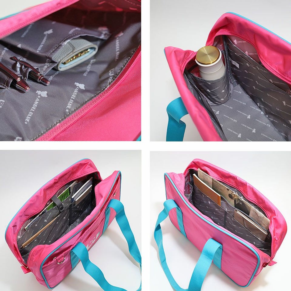 正面のファスナーポケットや、内装の仕切りポケット、両サイドのボトルポケットなど収納が充実。モバイルや小物、水筒を立てて収納でき、バッグの中をすっきり整えられます。