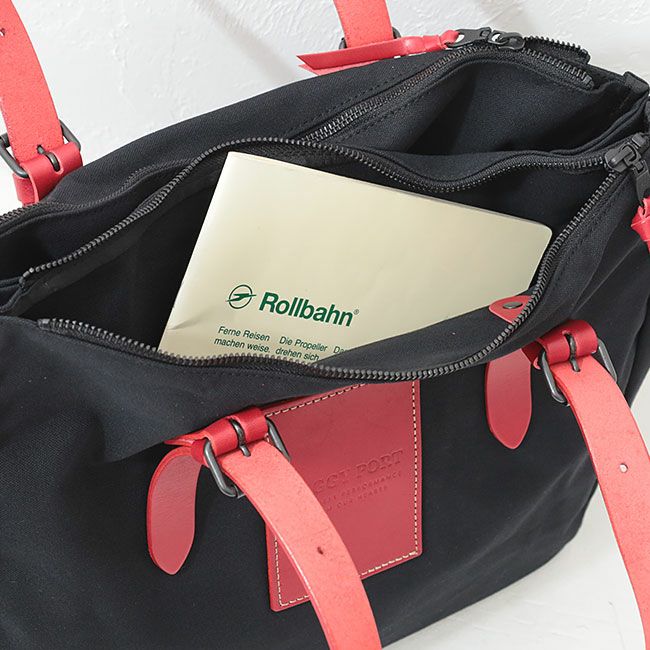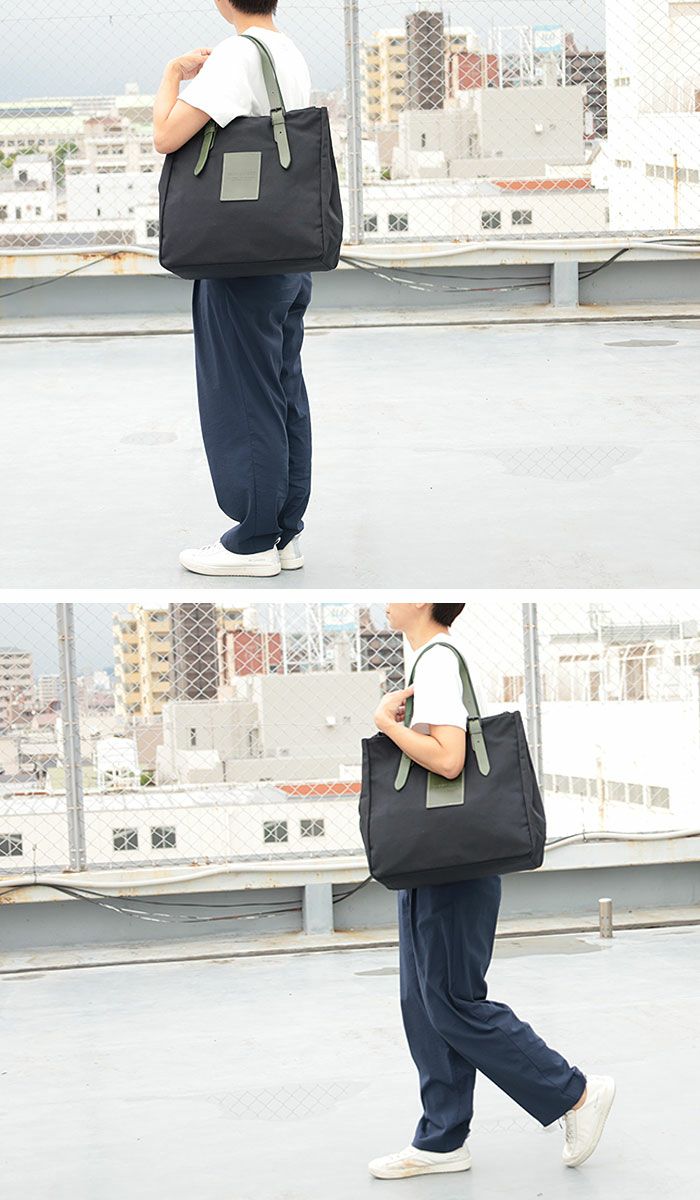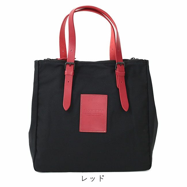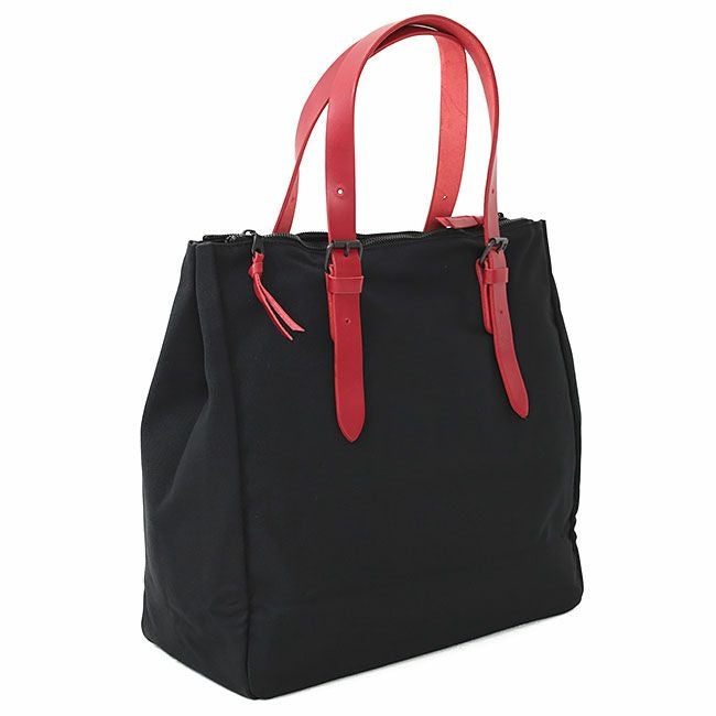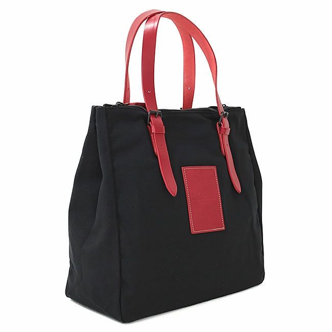 ブラックの帆布をベースに持ち手とロゴパーツの牛ヌメ革で色展開しています。