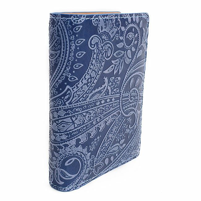 手染めで染色された藍染めレザーに、ペイズリー柄の型押しを施しています。