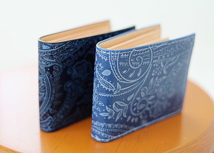 手染めで染色された藍染めレザーに、ペイズリー柄の型押しを施しています。