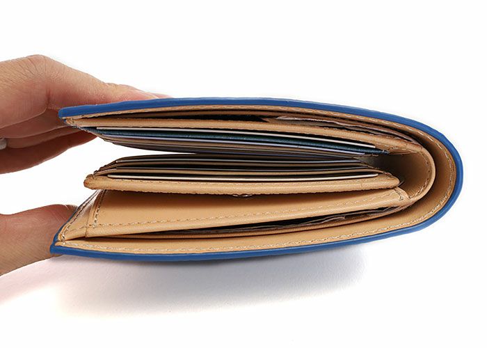スッキリとした定番の折り財布ですが、多数のカード収納や2つに分かれた紙幣の収納など、コンパクトながら収納力にも妥協のないデザインです。