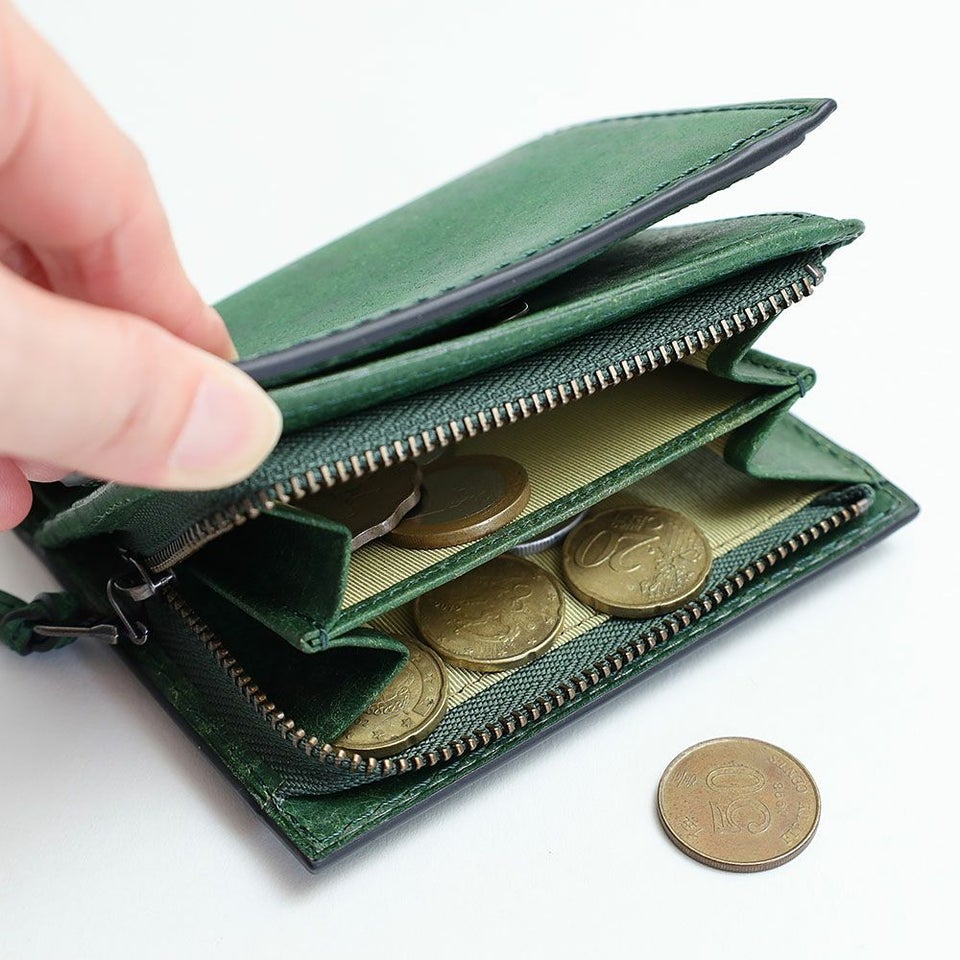 手に収まるミニマムウォレットですがカード入れ、ポケットは全部で10ヶ所、お札入れ、小銭入れも2つに分かれており、コンパクトなのに使い勝手のいいウォレットです。