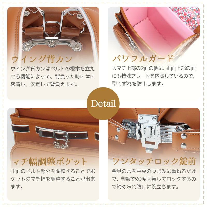 ウイング背カンはベルトの根元を立たせる機能によって、背負った時に体に密着し、安定して背負えます。さらに、形状安定樹脂(エコボーン)を内臓し、強度と耐久性に優れた作りになっています。上部金具はスライドできるので成長に合わせて広がります。