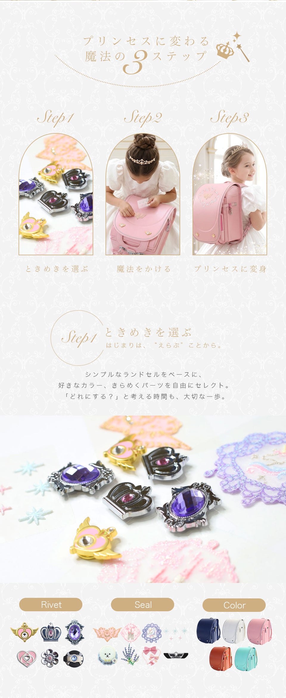 リベット鋲と刺繍シール ランドセルカラー