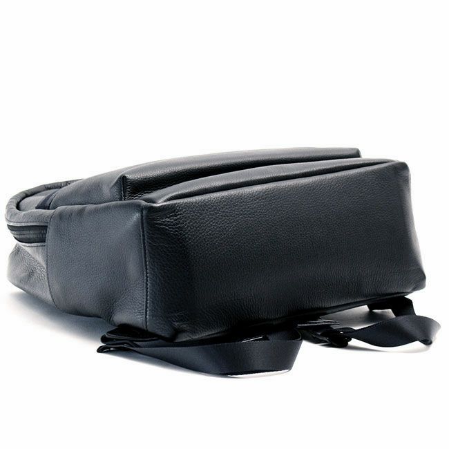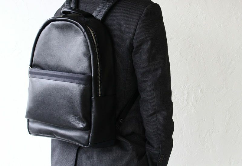 タッチ感の良いシュリンク革とシャープに見えるナイロンテープを組み合わせたレザーバッグをメインにしたトータルシリーズです。要所にライン柄のテープを使用することで見た目の軽さとカジュアル感を出すとともにデザインのアクセントにしています。メイン素材の革は国内原皮の牛ステアをクロームで鞣した後にシュリンク加工を施しています。薬品によって革を縮ませた後、さらに回転ドラムで空打ちすることで凹凸のあるシボを作り出しています。内装は全色ともに迷彩柄のプリントが入ったブラックコットンツイルで統一し、大人っぽいルックスながら内装には遊び心を取り入れて程よいカジュアルさを演出しています。ファスナーは操作性が良いシンメトリックファスナーを使用しており、配置する箇所によって番手の異なるファスナーを使い分けています。エレメントの色は、ブラックには光沢のあるエバーブライトのシルバー、グレー・ネイビーにはマットブラックを合わせています。金具の色もファスナーに合わせブラックには光沢のあるシルバーを、グレー・ネイビーにはマットブラックを合わせました。