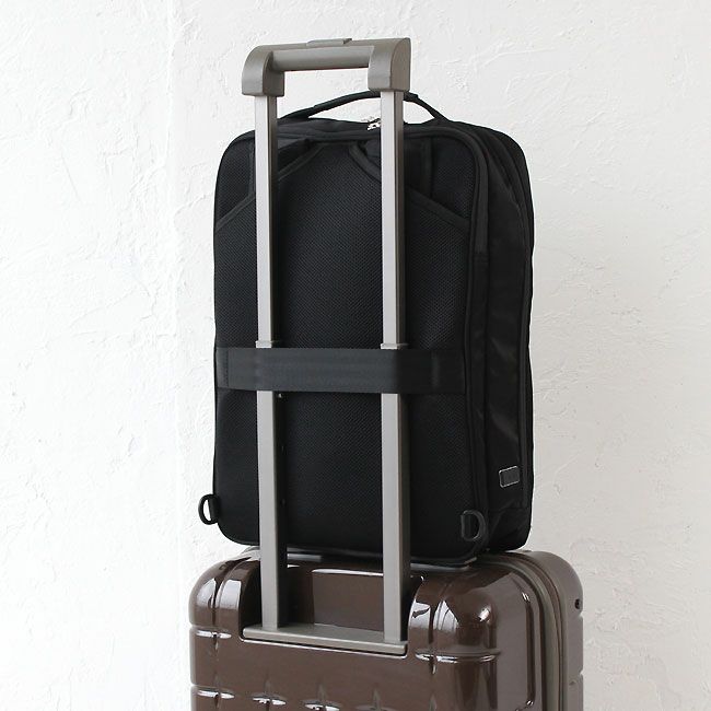 背面にはトローリーバッグのプルドライブハンドルに固定し、走行時のバッグのふらつきを防ぐセットアップ機能を搭載。出張などの時にも活躍します。