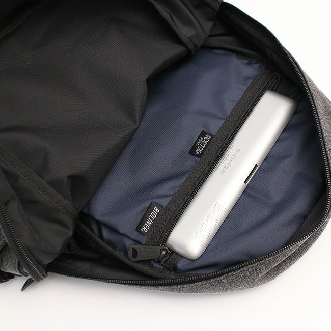 機能的なあおりポケットをデザインポイントにしたカジュアルシリーズです。様々なシーンでカバンの中からスムーズに荷物を取り出せることを想定して、フロントに機能的なあおりポケットを設けました。メイン素材は、タテ糸がナイロン糸、ヨコ糸はナイロンとポリエステルを撚り合わせた糸でヘリンボーンに織りました。また生地の風合いを出すために塩縮加工※を施して生地にボリューム感を出し、加工によって生じる適度なシワ感とコットンライクな風合いが、よりカジュアルな雰囲気を強めています。塩縮加工後にナイロンのみを液流染めという独特のシワが出る方法で黒く染めることで、柔らかでナチュラルな雰囲気が漂う杢調に仕上げました。内装の一部には、糸の段階でセラミック系の抗菌剤を練り込み、さらにデオドラント加工を施すことで制菌・抗菌・防臭・消臭機能を持つバイオライナーR を使用しています。