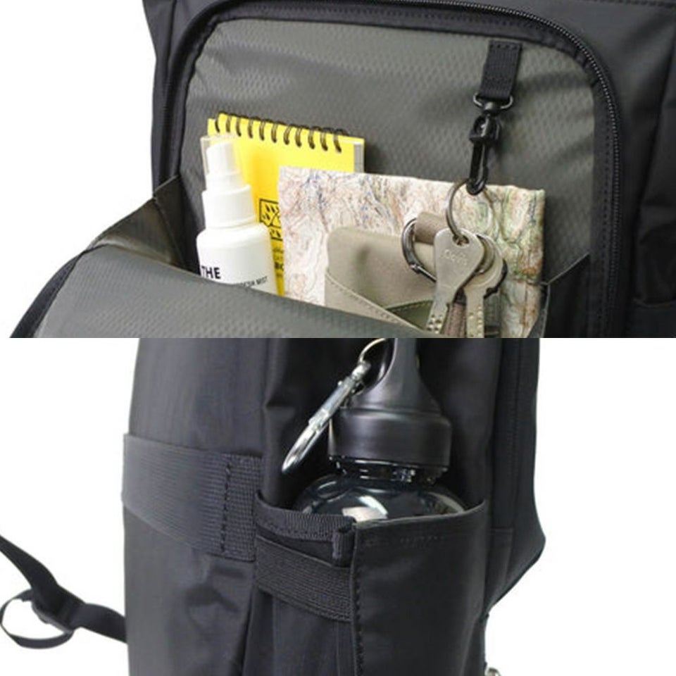 革や金属パーツを使わず軽量設計に。前面の楕円ポケットや、サイドの伸縮ポケット・ニットポケットなど、収納場所も充実しており、ペットボトルや傘の持ち歩きにも便利です。