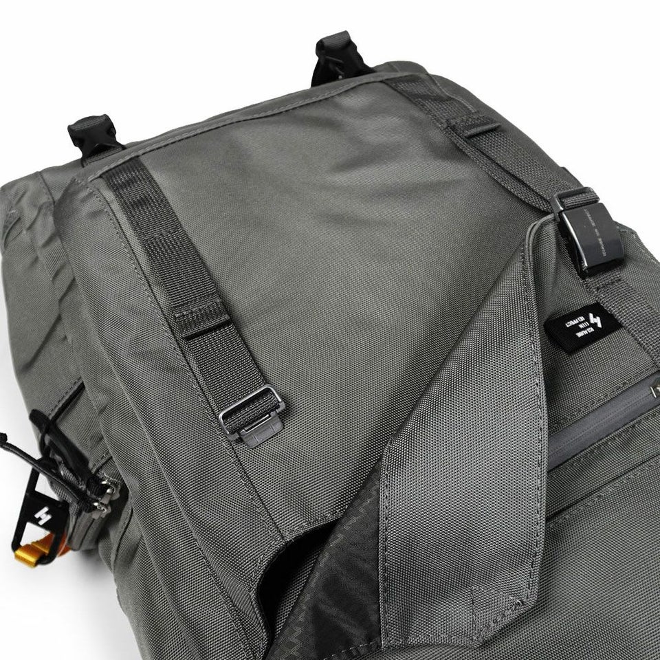 前ポケットのフラップには、上部を押すだけで外れるジョイントバックルを採用しています。見た目のアクセントになるだけでなく、荷物の出し入れがスムーズに行える実用的な設計で、日常使いでもストレスを感じさせません。