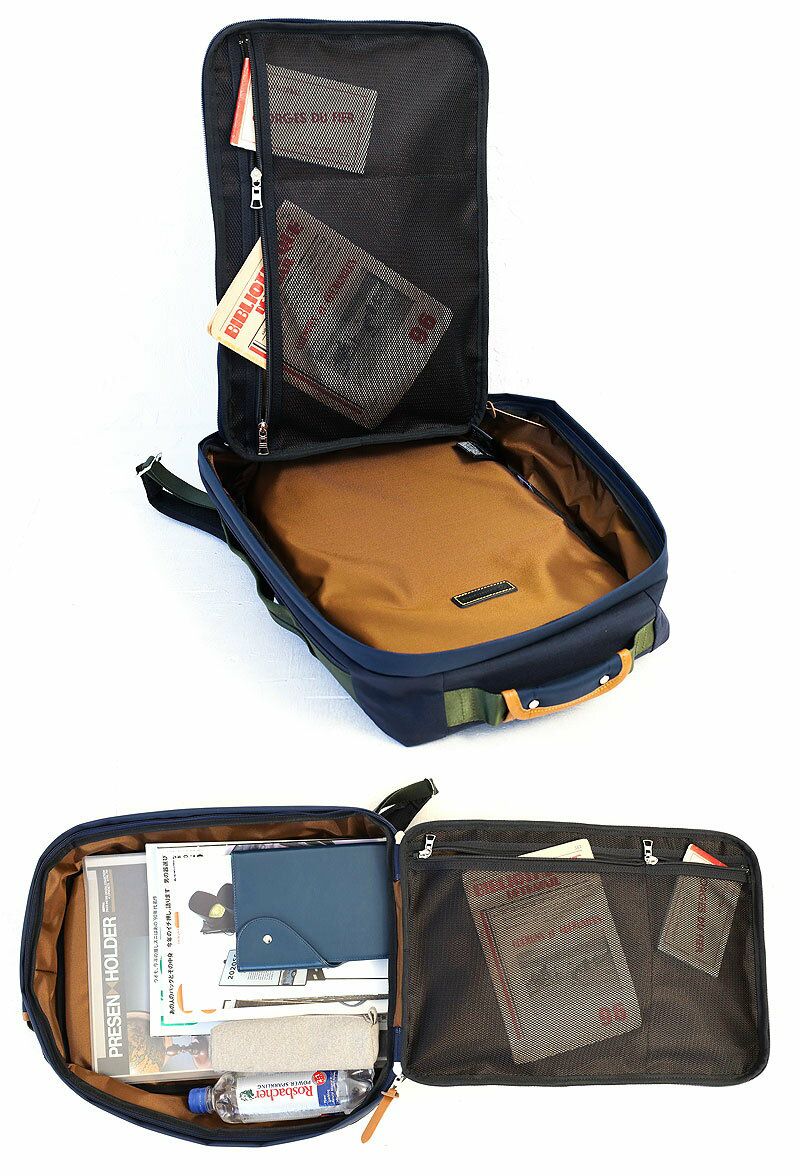 フロントのダブルファスナーでひらくポケット内部にはメッシュポケット、オープンポケット、ペンホルダーなどが施されているので、小物類もすっきり収納できます。
