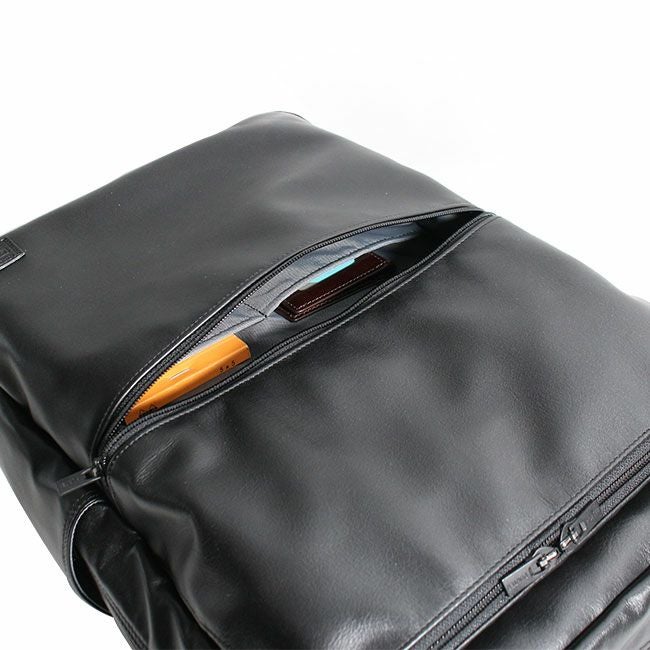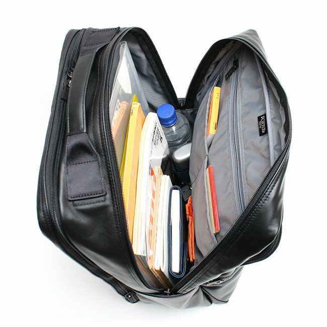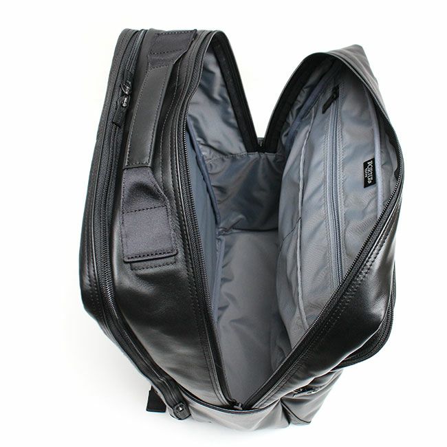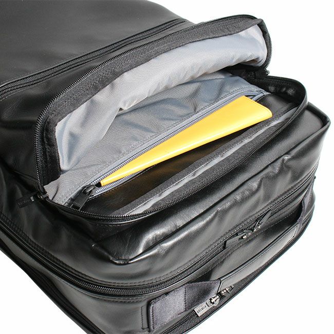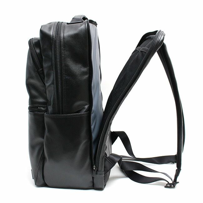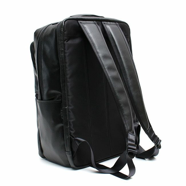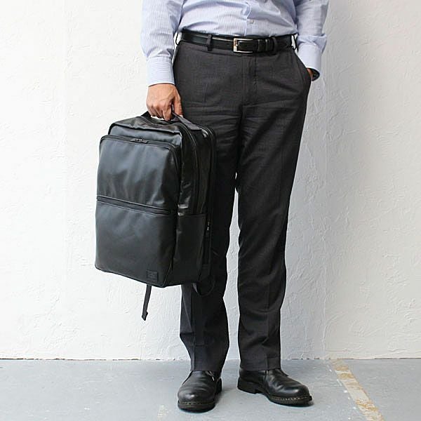 スタンダードなルックスに高い機能性を備えたビジネスシリーズ「TIME」としての特徴はそのままに、メイン素材を革にアップグレードし、全体をブラックワントーンにすることで上品でシックな印象に。スコッチガードTM加工によりお手入れも簡単。レザーでありながらフォーマルすぎず、より幅広い年齢の方にお使いいただけます。
