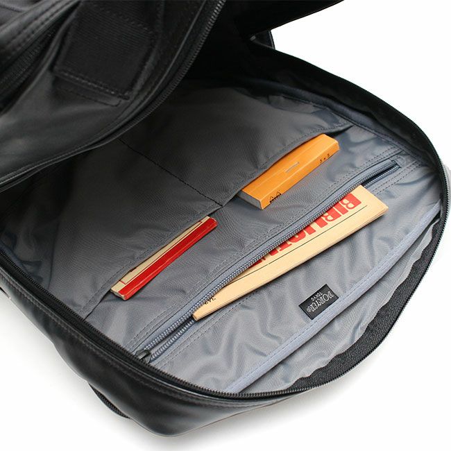 内装の生地にはテフロン(R)ファブリックプロテクター加工を施し、高い撥水性と防汚効果があります。 布帛カバンの作りを採用したシンプルなデザインなので、レザーのビジネスバッグでもフォーマルすぎない印象に仕上げており、より幅広い年齢の方にお使いいただけます。また要所にナイロン生地を使用しているので軽量に仕上がっているのも特徴です。