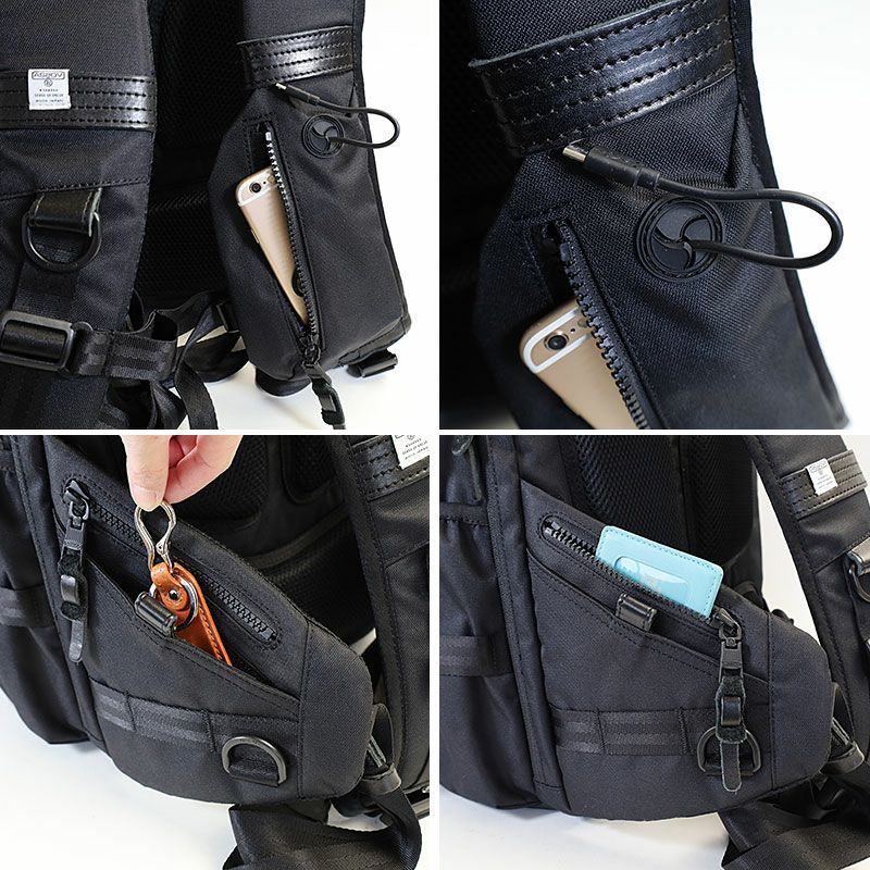 左ショルダーハーネスには、スマートフォンやイヤホンなどの小物を収納出来るジップポケットを配置しています。