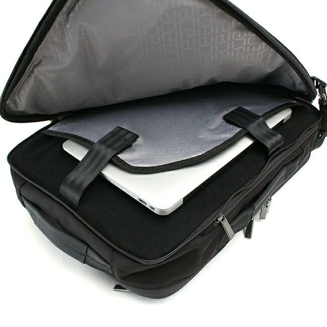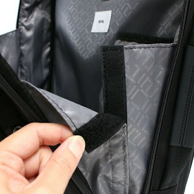 背面の気室には独立したPC収納を設け、15インチクラスのPCに対応。内側にはPCの表面などにキズがつきにくいパイル生地を使用しています。また、L字ファスナーを採用し、タテ・ヨコどちらからでもPCの出し入れがしやすい構造です。