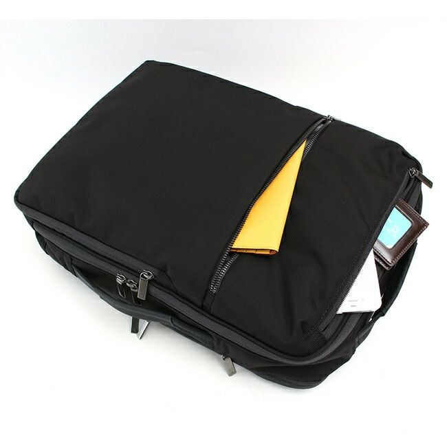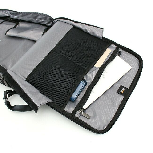 リュック使用の際には通常デッドスペースになりがちなフロントのトップ部分にはメガネやスマートフォンなどの小物を収納できるユーティリティポケットを配置。内側にキズがつきにくいパイル生地を使用しています。