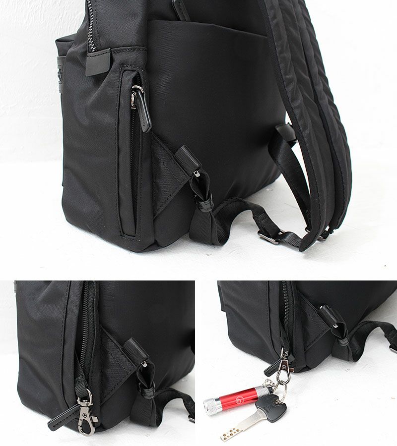 鍵など小物の出し入れに便利なキーフック付きサイドポケットがあります。
