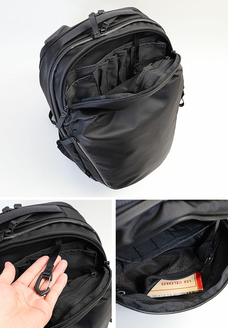・上部ファスナーポケット×1(内側にオープンポケット×3、ペンホルダー×3、ファスナーポケット×1、ナスカン)