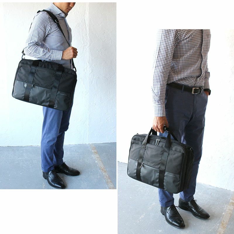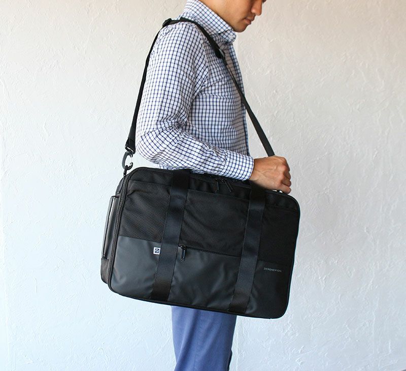 ブリーフケースに付属のショルダーベルトを装着し、ハンズフリーのショルダーバッグへと、3通りの使い方ができるマルチバッグ。