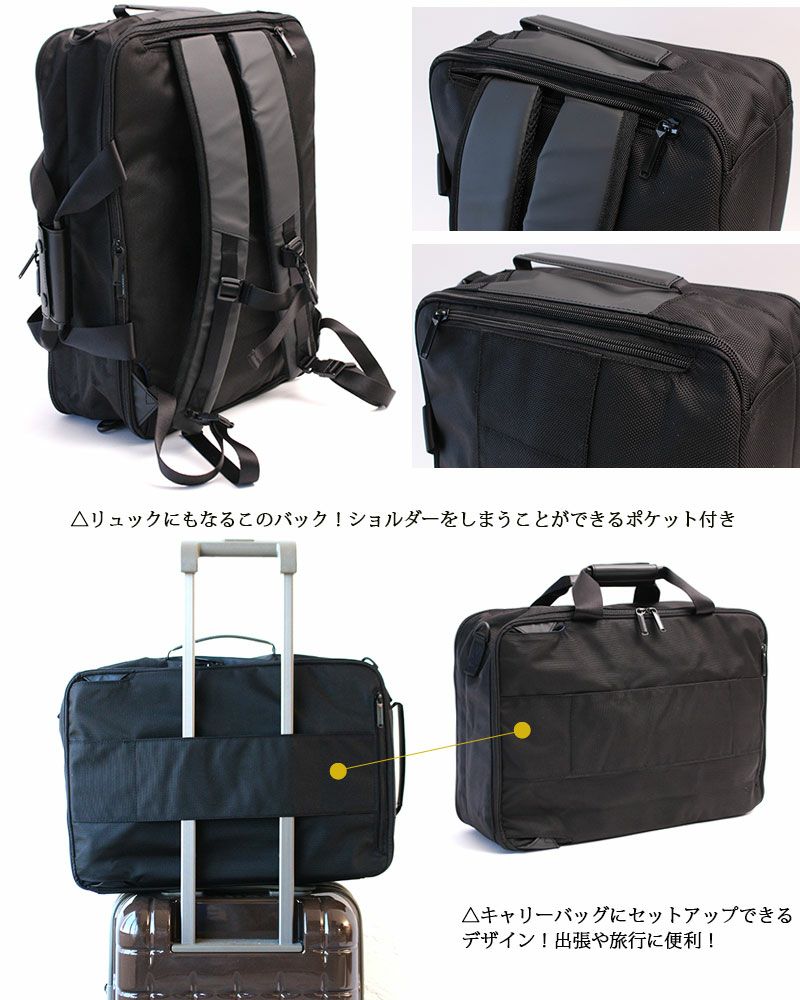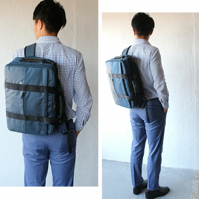 前ポケットはサイズ違いで小物の収納に便利な仕様。背面にはセットアップ機能も搭載し、カジュアルな雰囲気ながら、多機能感にあふれたビジネスバッグです。