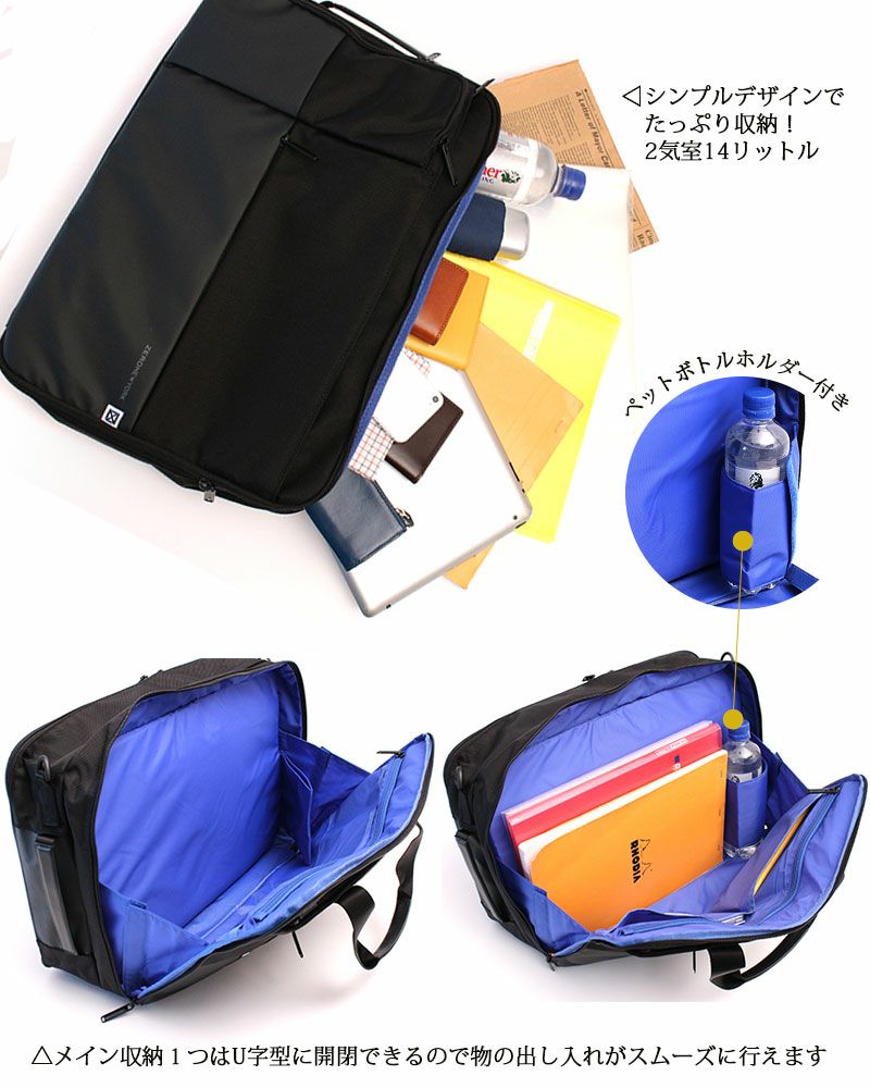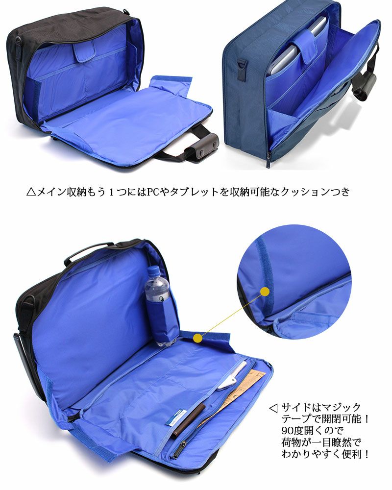 収納力のある厚マチ仕様で、仕分けしやすい2気室タイプ、シンプルな薄マチ気室のほか、メイン気室にはPC収納スペースがあります。