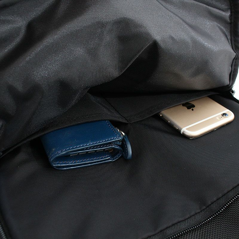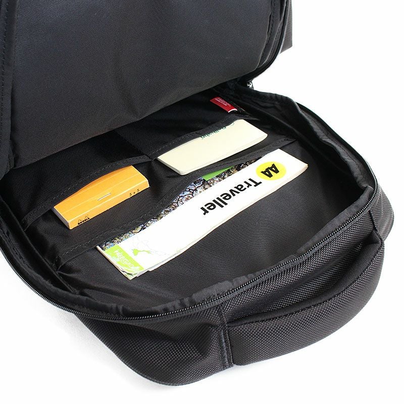 フロント上部にも大きめのファスナーポケット、背面にはノートPC専用スペースも備えられており13インチのノートPCを収納できます。
