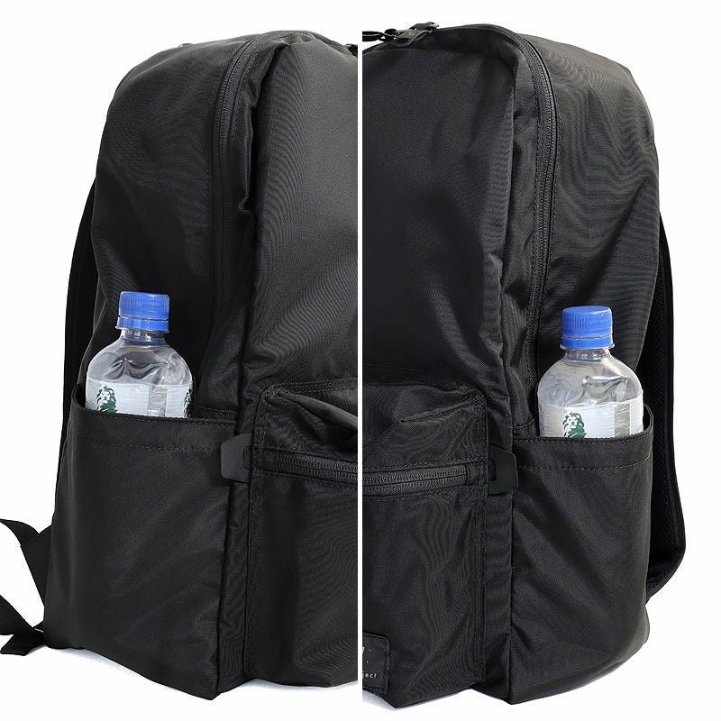 両サイドには500mlペットボトルが収納可能なオープンポケットがあります。
