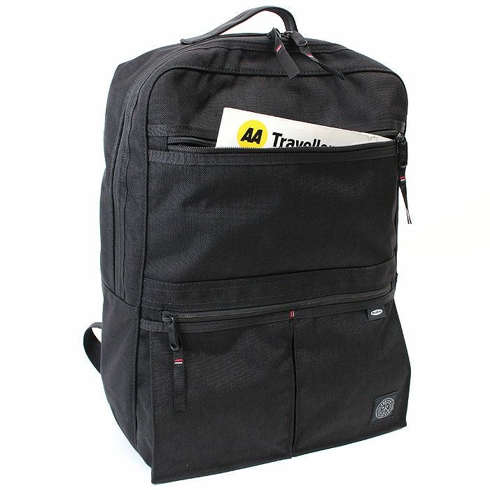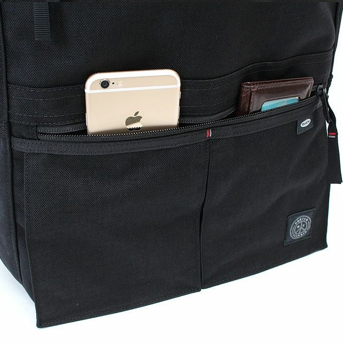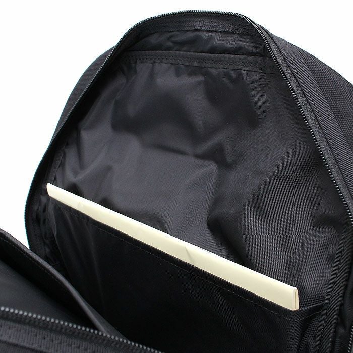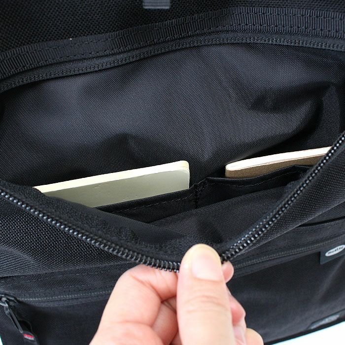 フロント上部のファスナーポケットは、A4サイズの書類が入る大きさで、内装には更にオープンポケットが2ヵ所備えられています。