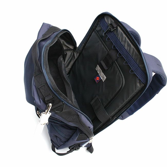 本体前上部のポケットは左右どちらからもアクセスする事が可能で、ポケットの下層はループ仕様になっており、