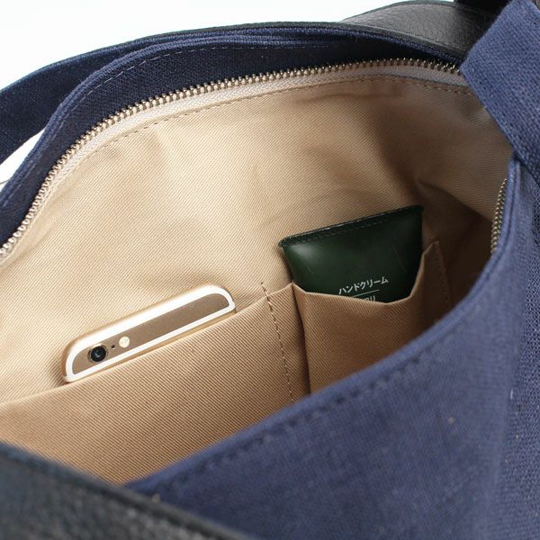 内側にはファスナーポケット、フリーポケットが備わっているので、細かな荷物、使用頻度の高い小物を収納できるようになっています。
