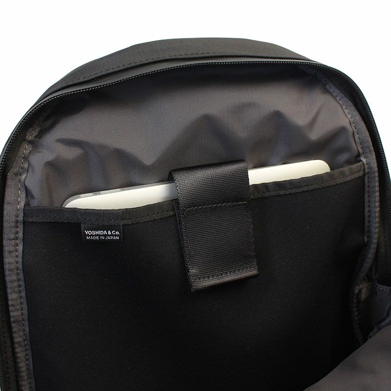 シンプルなルックスながらも高い機能性を備えており、ノートPCやタブレット端末を収納できるクッション材入りのポケットを配しています。内装は視認性を高めるグレーの生地を使用しています。上質で大人っぽさのある雰囲気にこだわり、外装は極力ステッチを控え、すっきりとシンプルに仕立てました。