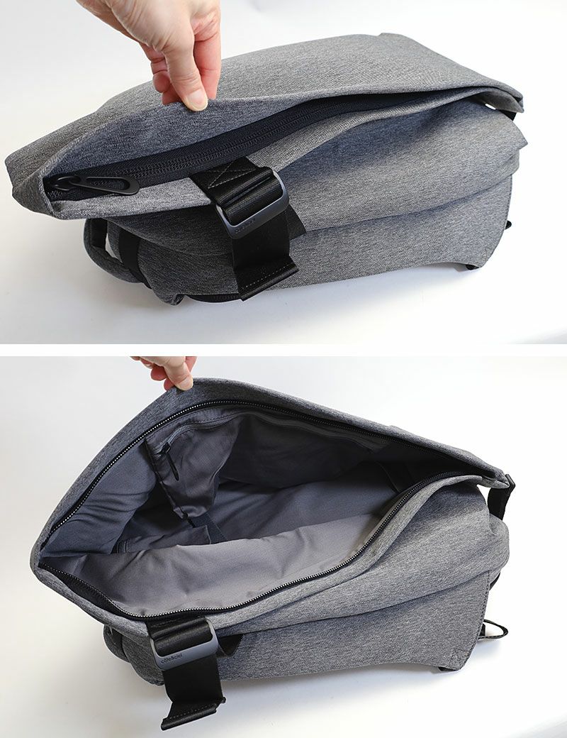 メインコンパートメントは、片方の肩からベルトを外してバッグを前に持ってくると下ろす事なく背負いながら物の取り出しが可能。中にファスナーポケットがあり、小物などを収納できます。