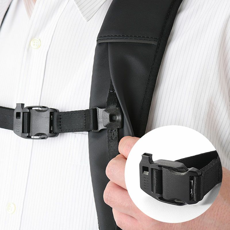 ・リュックのズレ落ちを防ぎ、胸元で高さを調節可能なベルト機能。(不要な時は簡単に取り外しが可能。)ホイッスルの付いたバックルを採用。