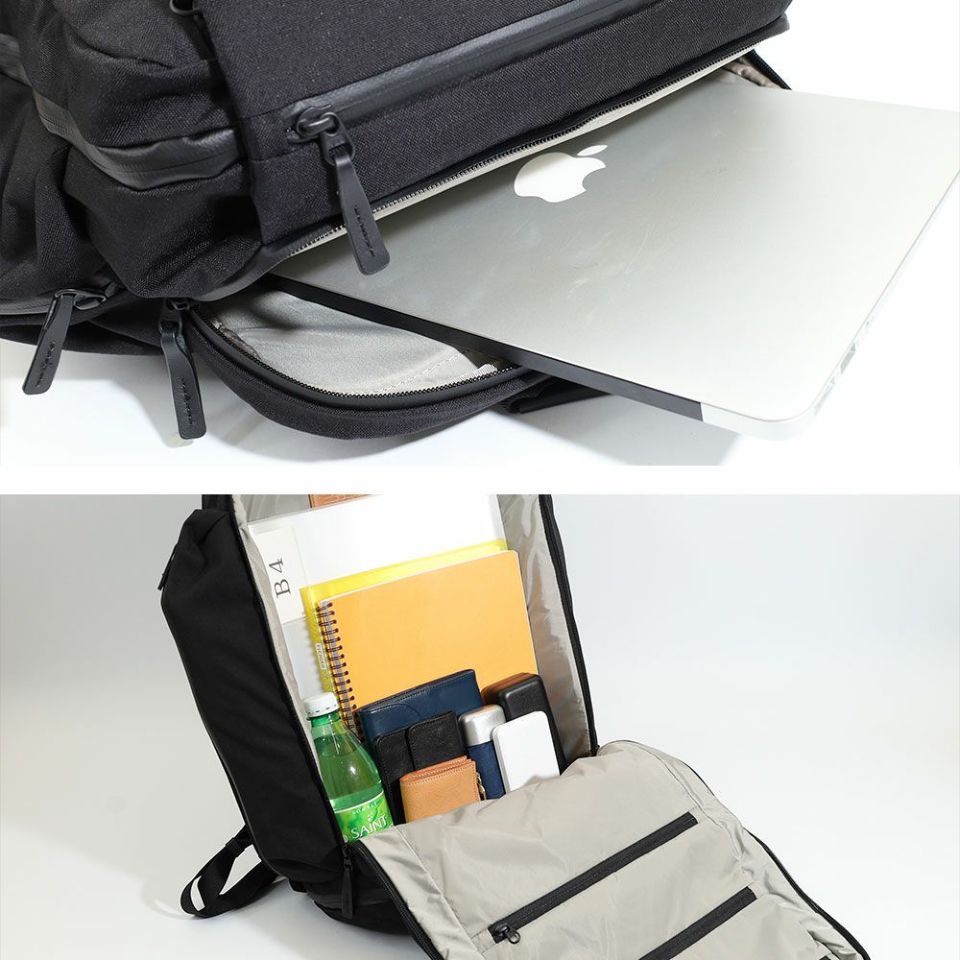 テクノロジー用品と衣類を分けて収納できる2コンパートメント構造。出張にもレジャーにも対応し、整理整頓しやすい設計です。
