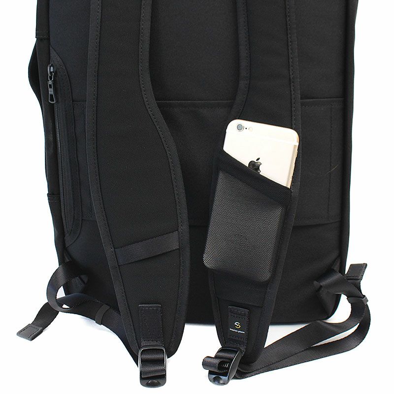 ショルダーストラップの片側には、ワイヤレスヘッドホンやICカードの収納に便利なストレッチ素材のメッシュポケットを装備しています。