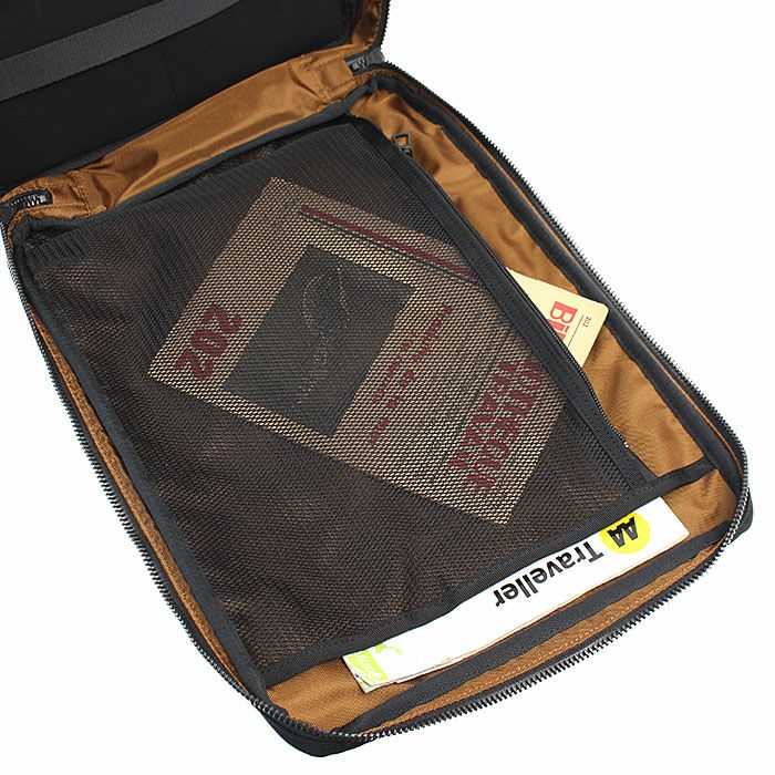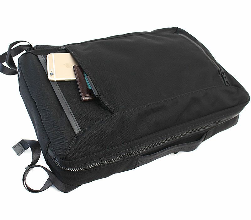 フロント下部のファスナーポケットの袋布には撥水・防水性に優れた軽量な3レイヤーナイロン、底部分にはPVCメッシュを使用しているのでペットボトルや折りたたみ傘の収納に便利です。